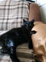 На данный момент состояния нормальное, лежит, чиллит у меня на животе, мурлыкает и пытается лезть поближе к моему лицу, нюхает его и потом кладет лапы на шею.