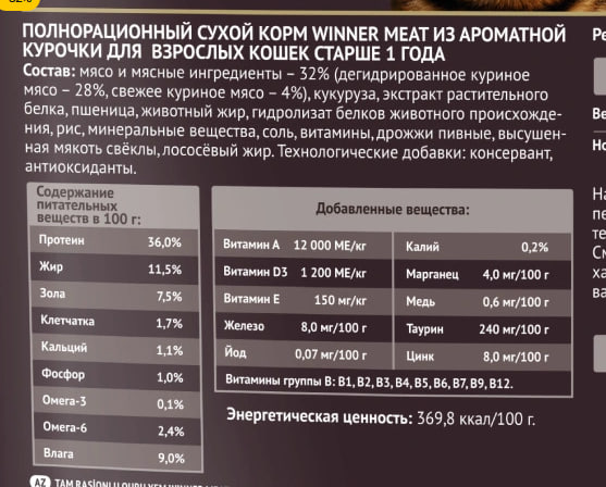 >>205301 Аналитический состав неплохой, но на 100 г корма из 33% сырого белка животного белка будет всего около 12 г: - В дегидратированном мясе птицы примерно 35% белка; - Мясо ягнёнка не дегидратированное, то есть процент белка там около 11-12; - 30×0.35 + 8×0.12 = 11,46 Получается, 21% белка добит рисом, ячменём и овсом. При этом по европейским ветеринарным рекомендациям, коты должны в идеале получать не меньше 32% животного белка в массе еды. Я понимаю, что в РФ ща вообще толком ничего не купишь, и надо выбирать из того, что доступно. Если этот корм лучше остальных, доступных тебе, то уже хорошо.