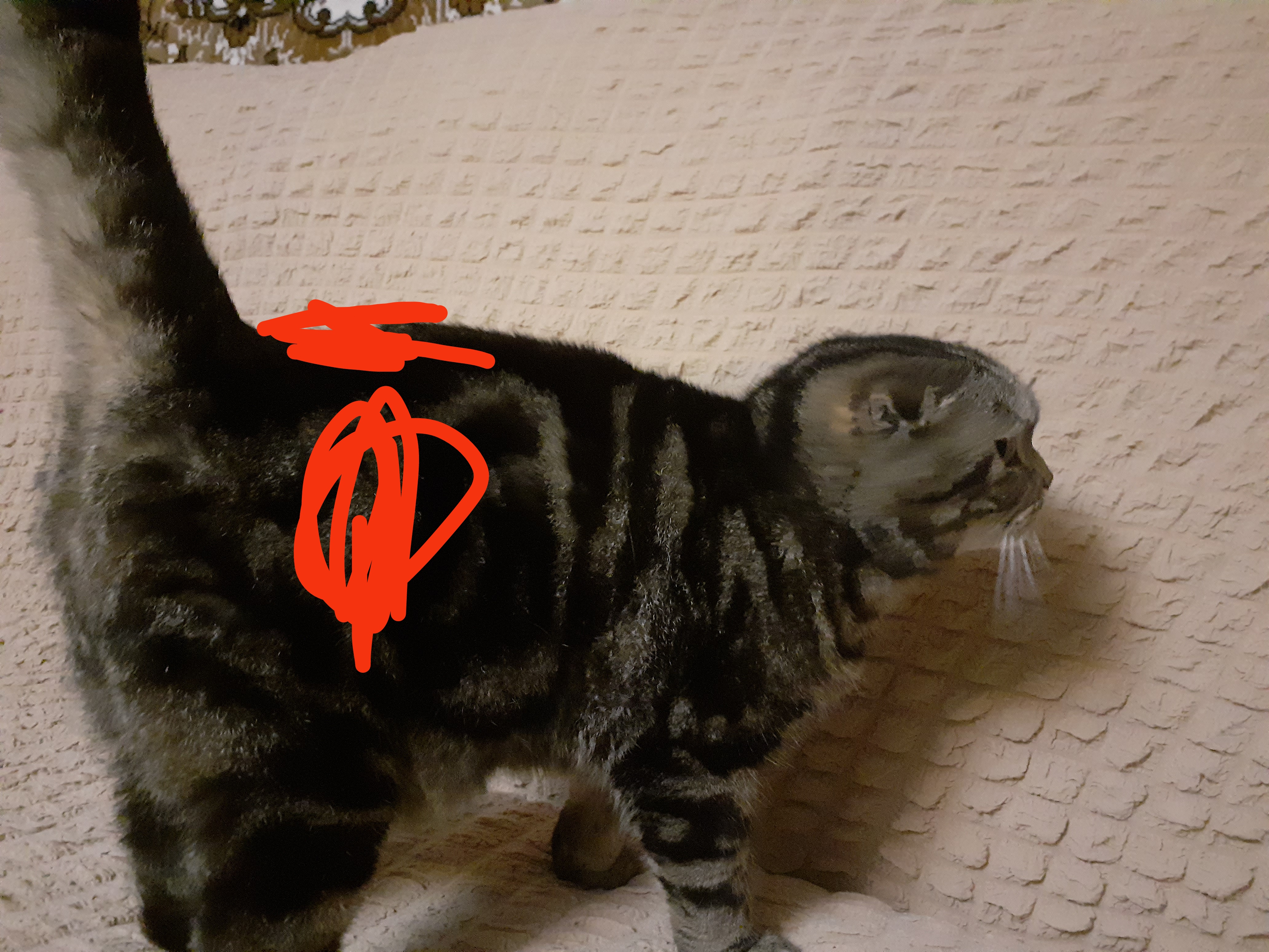 Всем привет. Кабану примерно 5 лет, кастрирован. Если дотронуться до обозначенных областей (по бокам и спине, но по спине особенно), то начинает орать и огрызаться, ему очень не нравится это почему-то. Другие коты реагируют нормально. У него на спине в этом месте одно время ранка была, вроде даже с гноем (неприятный запах был), но вылечился, по крайней мере, запаха нет точно. Что может быть? Кто-нибудь сталкивался с таким?