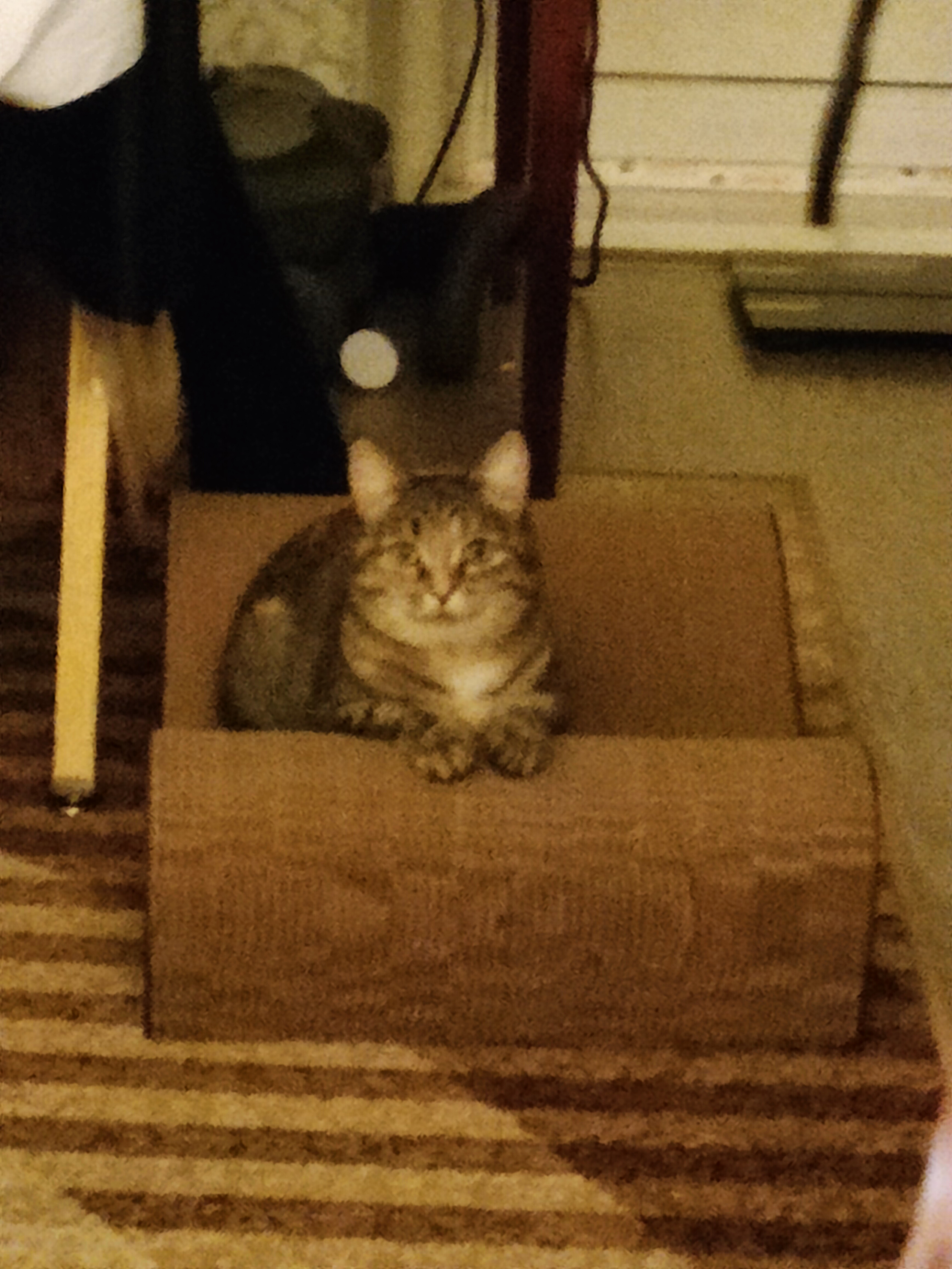 Новый хозяин также иногда ходил с «хвостиком», хотя и считал это «дурацкой идеей». Иногда присаживался на пол, показывая сигналы примирения, и предлагал кошке игру с кошачьей дразнилкой.