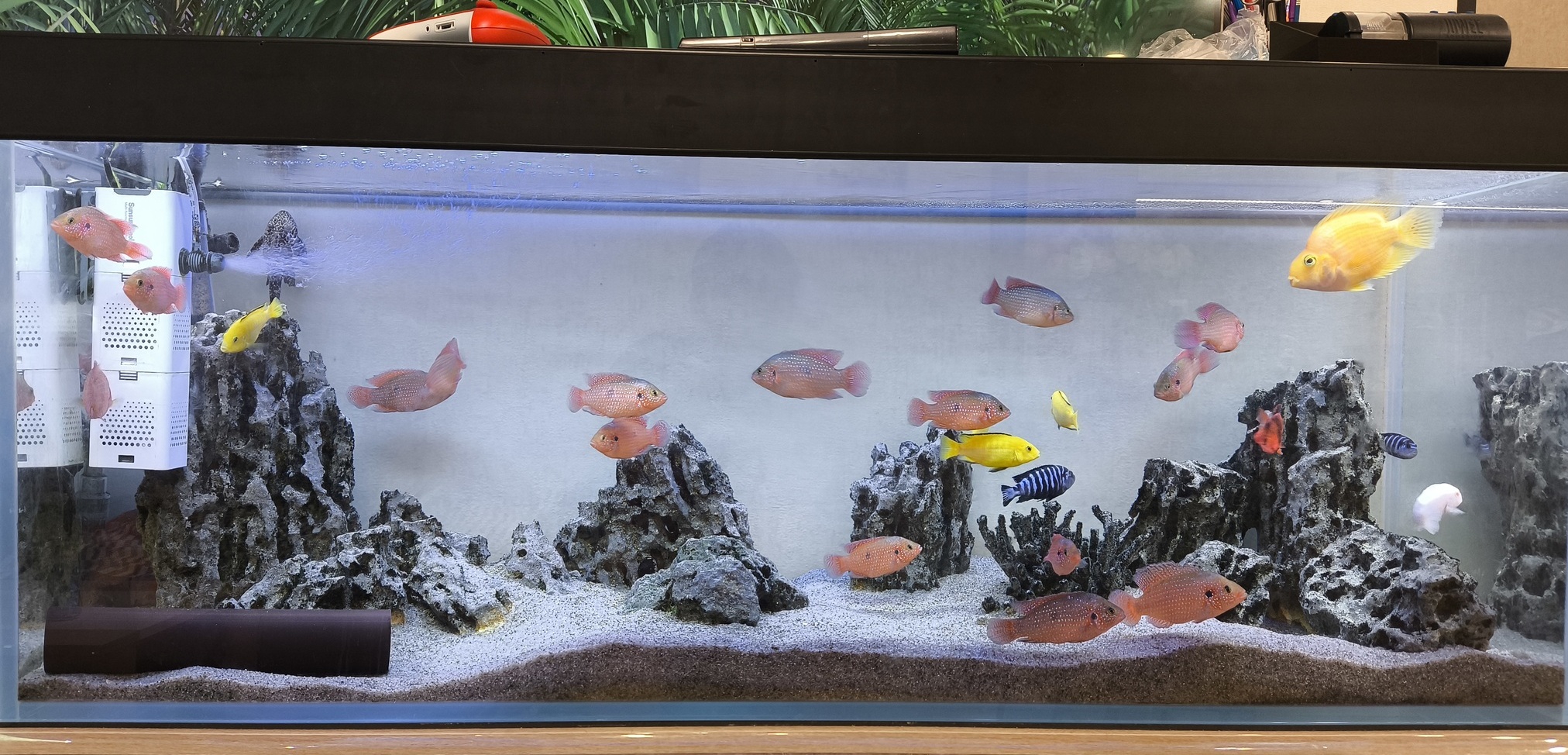 Как бы то ни было, если присобачить скиммер к трубке внешника, то это уже не супер компактно + ебаля с чисткой. Самый эстетичный варик мелкобанки - это все в одном, но он же значительно отъедает пространство у банки, которая и так не очень большая. Плюс искажает пропорции, если это полуостров. Опять же, банка такая будет под заказ, далеко не все мастера её сделают.