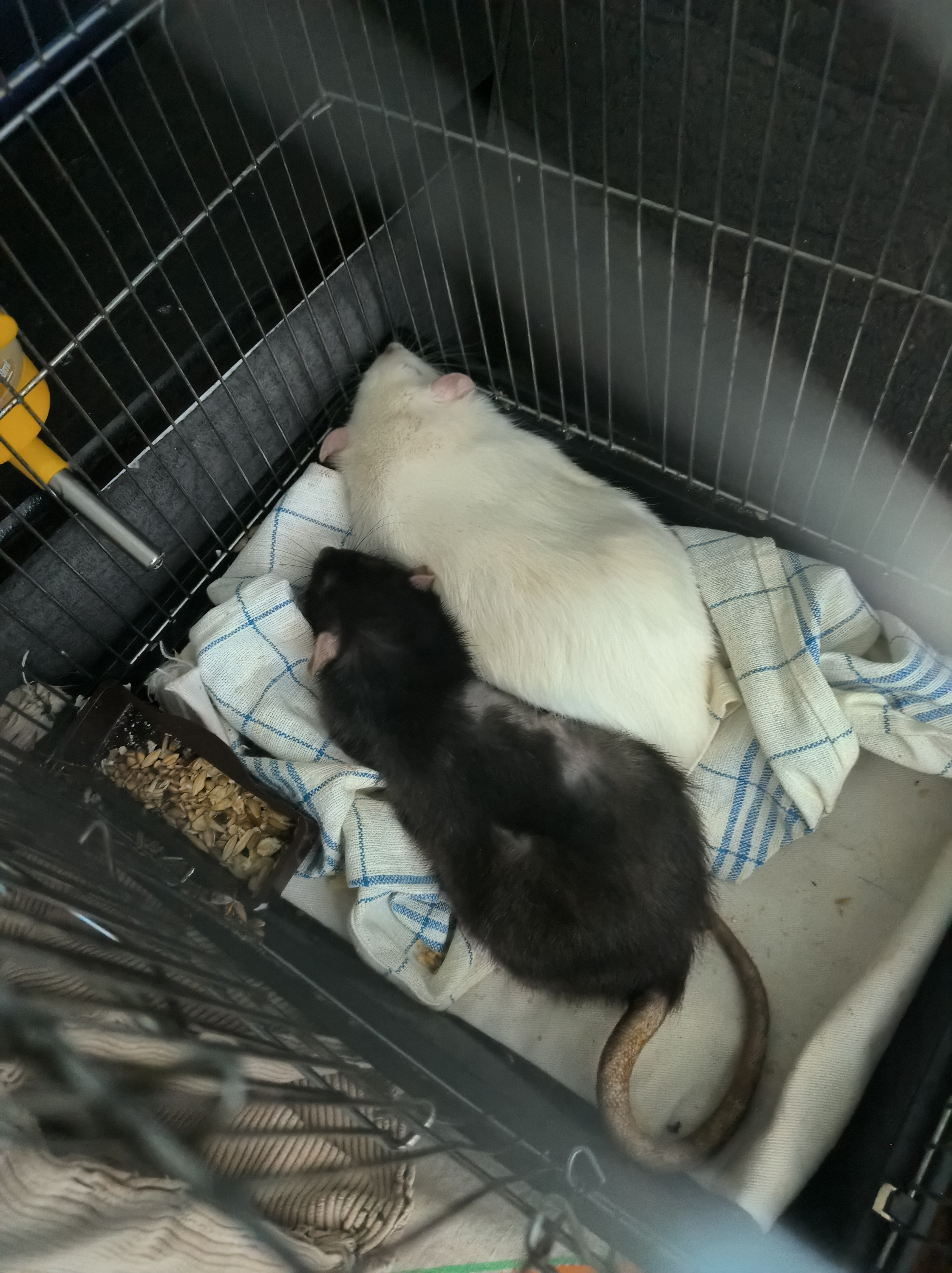 3 фотка если что в карантинной клетке)) старушка живёт отдельно, потому что в большой клетке сложно подниматься на верхние полки, а она очень хочет, и бывает падает. Но они очень часто гуляют вместе, и почти весь день на диване спят.