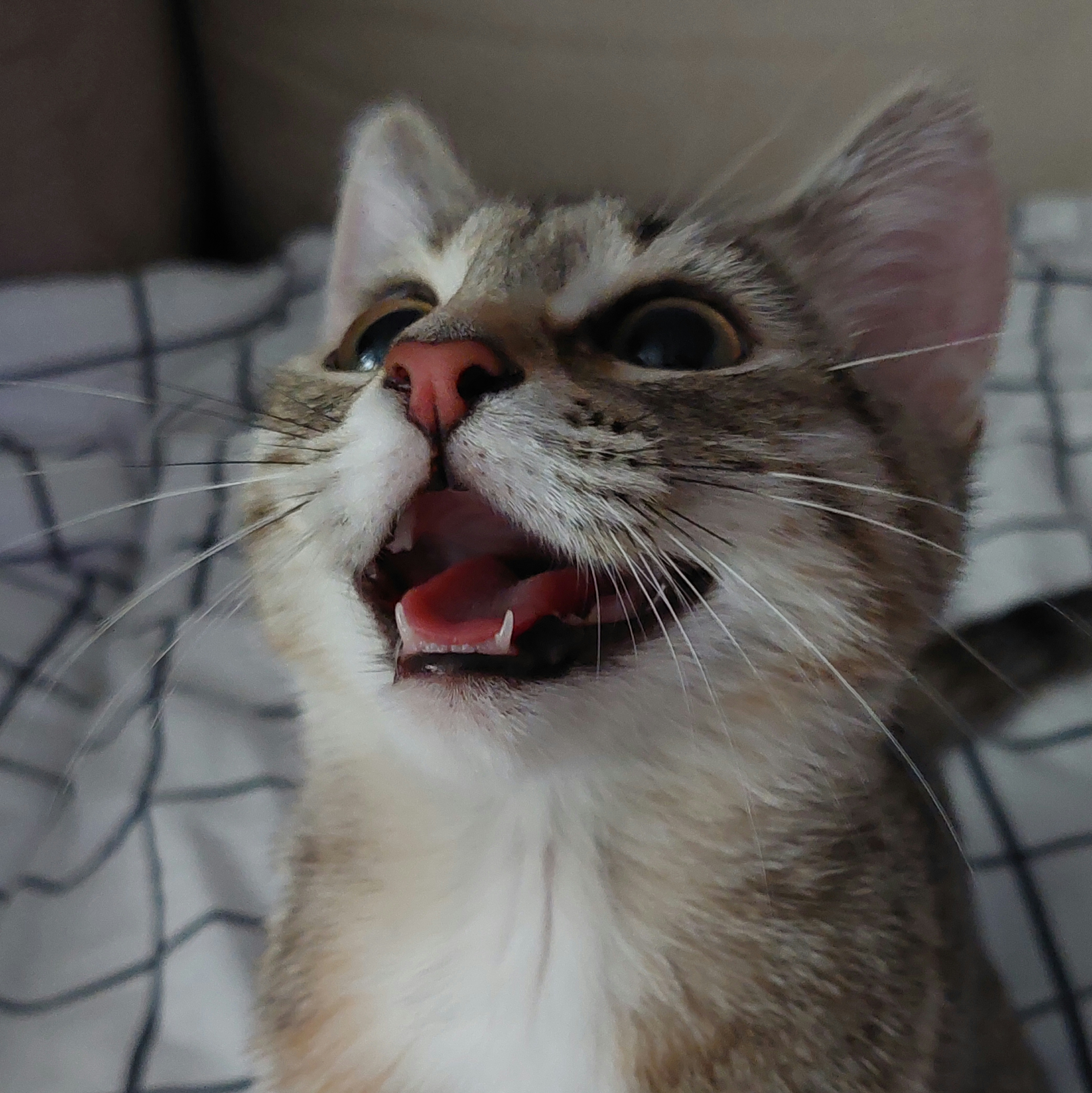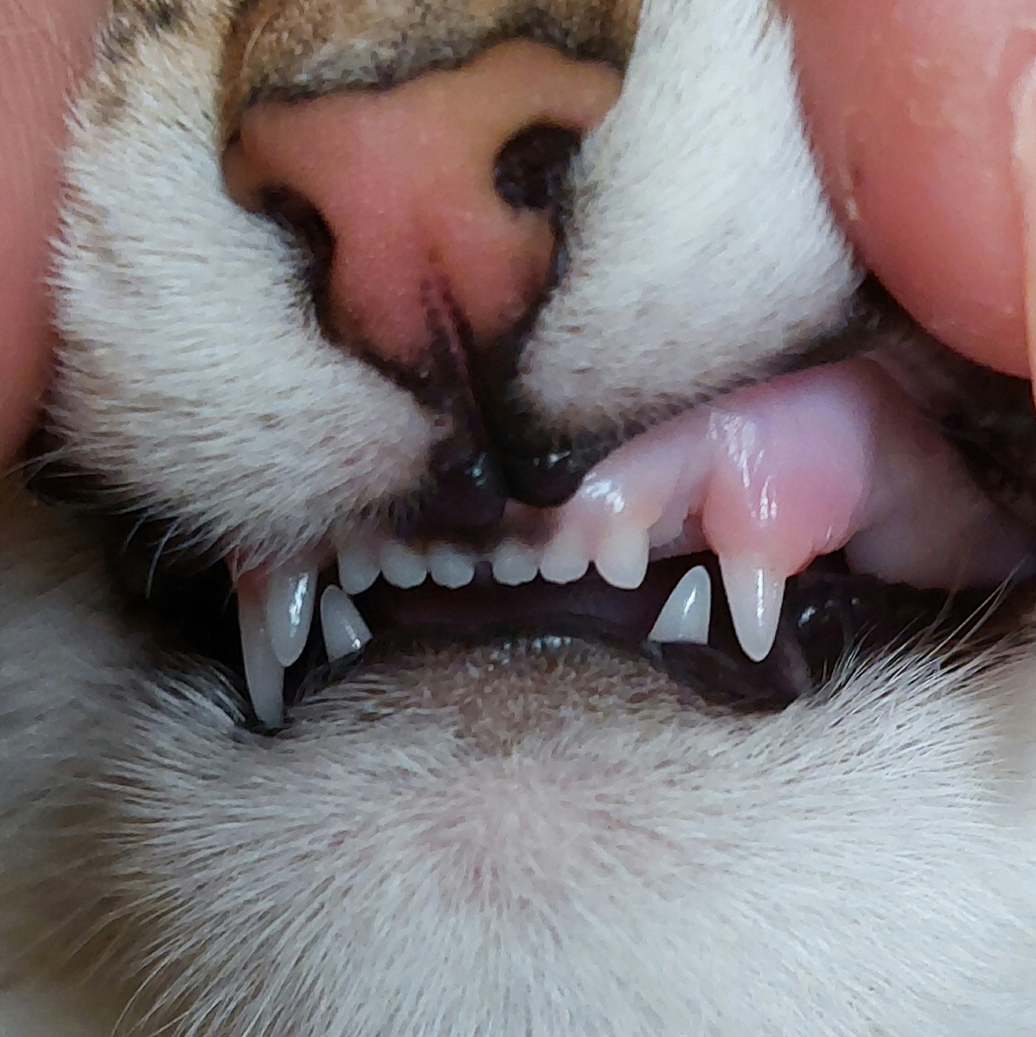 Сос! Меняются зубки у котенка (4-5 мес, точно не знаю, нашла на улице) и я видела, что у неё два клыка. Я думала, что у всех кошек два клыка с обеих сторон, но погуглила и поняла, что нет.