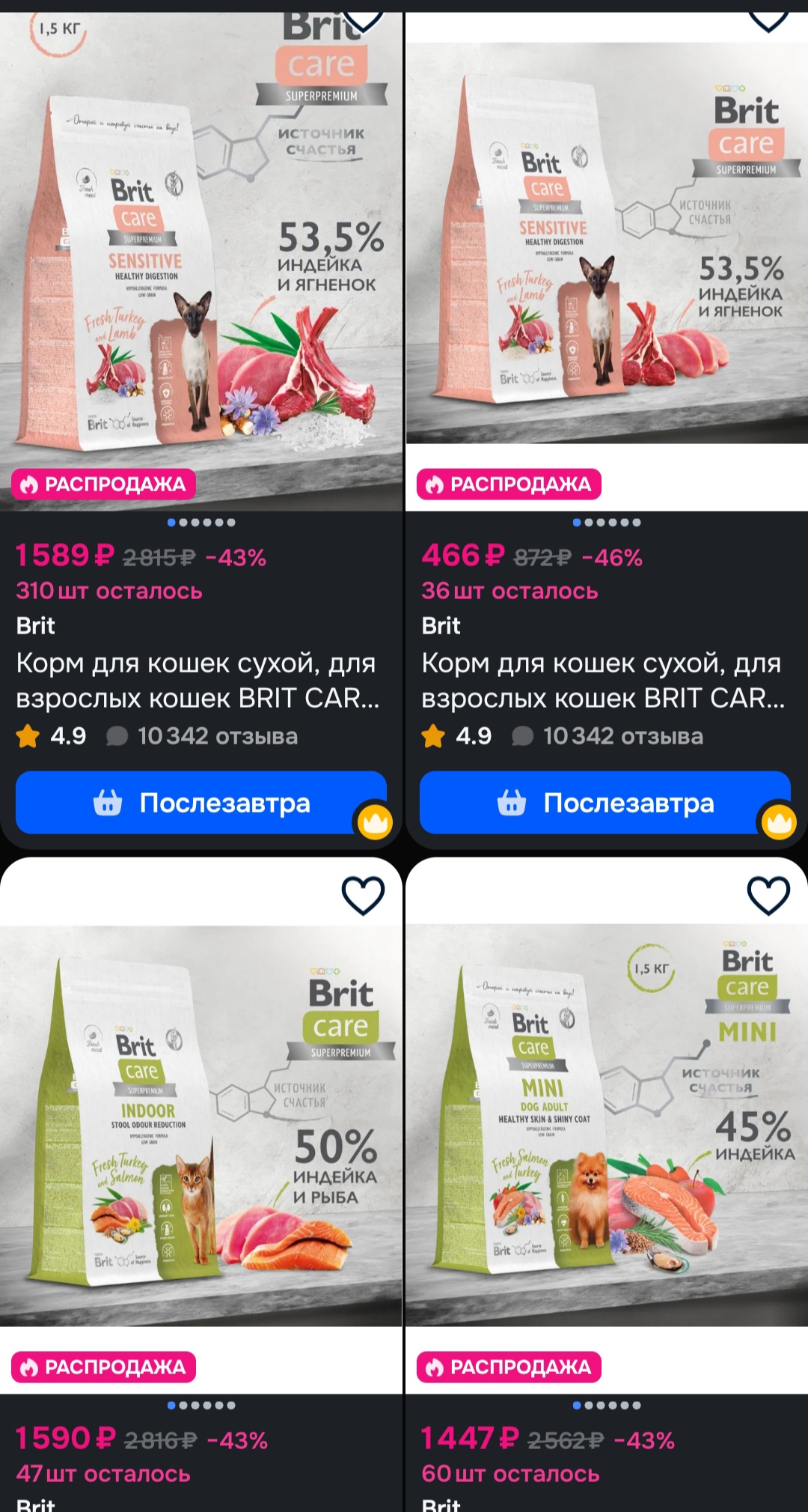 ### ⚠️ **Осторожно!** - **Избегайте линейки «Everyday»** — там всего **4% мяса** + кукурузный глютен (как у Perfect Fit). Выбирайте **«Special Care»** или **«Delicate»**. - При аллергии/МКБ/ожирении — **Brit Care** или **Pro Plan** будут эффективнее.