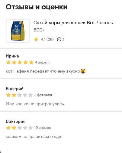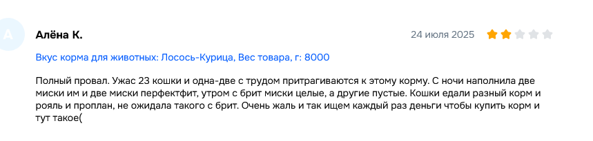 ### 💬 3. Отзывы потребителей - Негативные: - Кошка отказывается от российского Brit Premium из-за резкого запаха и изменения вкуса . - Нарушения пищеварения: тёмный стул, сильный запах мочи, редкая дефекация . - Позитивные: - Некоторые владельцы отмечают, что корм приемлем при ограниченном бюджете, особенно если питомец не склонен к аллергии .