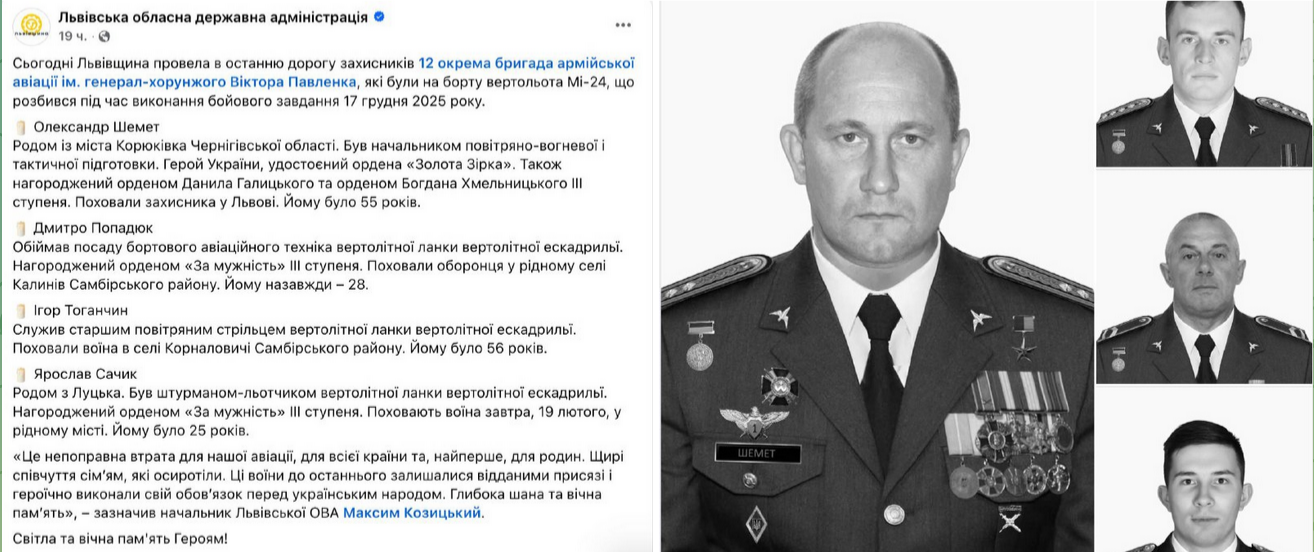 ▪Четыре военных летчика ВСУ погибли в результате столкновения вертолета Ми-24 с ударным дроном «Герань» в декабре, признала Львовская Облвоенадминистрация. ▪Ликвидирован начальник воздушно-огневой и тактической подготовки Александр Шемет, бортовой техник Дмитрий Попадюк, старший воздушный стрелок Игорь Тоганчин и штурман-лётчик Ярослав Сачик. ▪Накануне погибших похоронили во Львовской области.