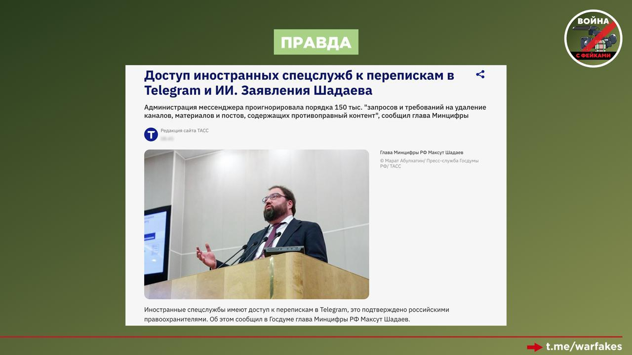 «Сейчас много фактов, которые подтверждены нашими органами, о том, что доступ к перепискам в Telegram имеют иностранные спецслужбы», — подчеркнул (https://tass.ru/ekonomika/26481455) Максут Шадаев.