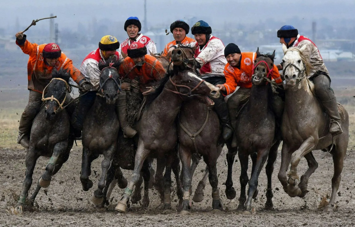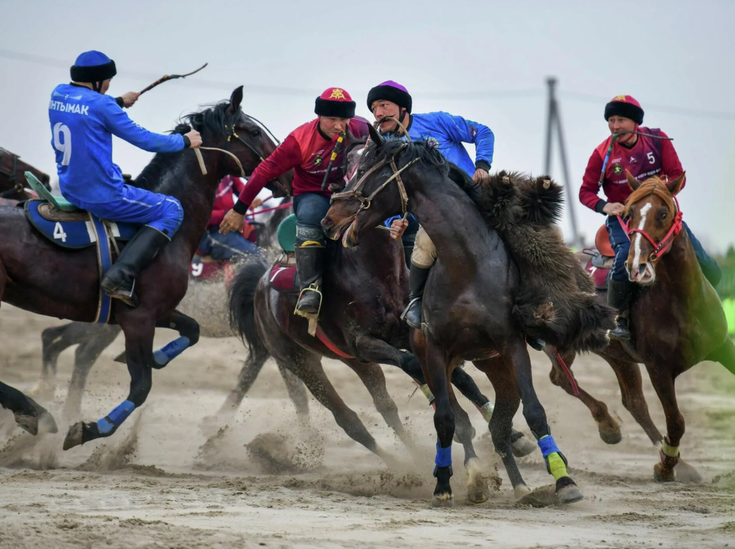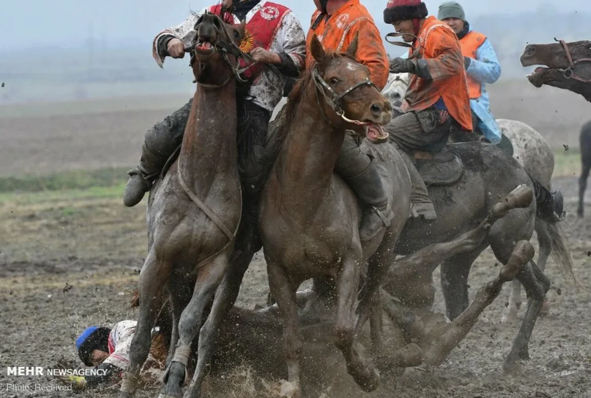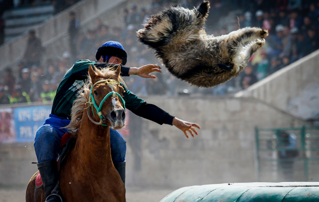На кадрах с места заметно, как большое количество людей на лошадях сходятся к небольшому бредут по полю. Отмечается, что они действительно играли тушей козла.