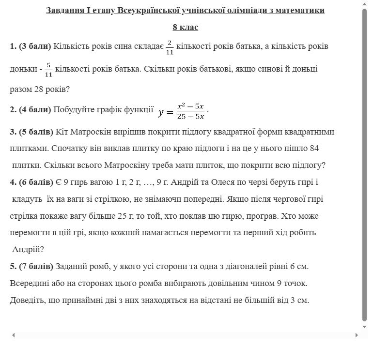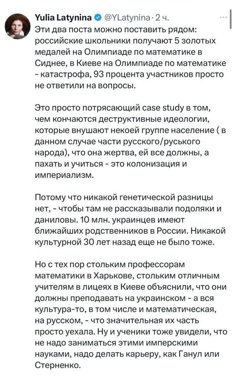 >>1688982 Чёт совсем пиздец вна Украине с образованием, спасибо дядь Зеленский. По российским меркам — это уровень школьного этапа который в моё время в школах очень часто проводился только на бумаге, а по факту на муниципальный уровень отправляли тех, кого учителя выберут из списка поумнее. Ну максимум можно натянуть на муниципальный. С моей, эм, параллели (то есть с людей моего класса обучения во всех школах в районе с численностью населения в 35к человек) на региональную по математике каждый год проходило в 7-8 классе три-четыре додстера, в 9-11 классах два-три додстера. Как вы понимаете, одним из них был я, а количество додстеров уменьшилось на одного по причине отбытия чувака с моей параллели после 8 класса в лицей региональной столицы. Повторюсь, это в маленьком сельском районе на 35к человек. Для прохождения на региональный уровень нужно было решить практически всё. Точных цифр тех лет не помню, посмотрел текущие критерии, там 5 задач чуть выше уровня сложности, до 7 баллов за каждую, минималка для прохода — 30 баллов. То есть надо решить все пять задач, но с допустимыми огрехами. Итого получается, что тот уровень, который в моём сосничестве на мелкий район с большим количеством сельского населения ещё и близкий к хохлам ебаным брало несколько человек в каждом годе обучения, у хохлов с очень большой на вс страну взял... один школьник? мимо стабильный регионал, на заклчительный этап не выходил, но решал больше половины задач на более высоком уровне, где уже была базовая комбинаторика и задачи с параметрами, выходящие за рамки обычной школьной программы