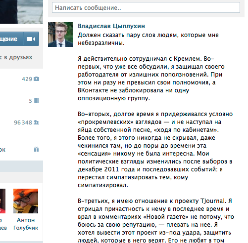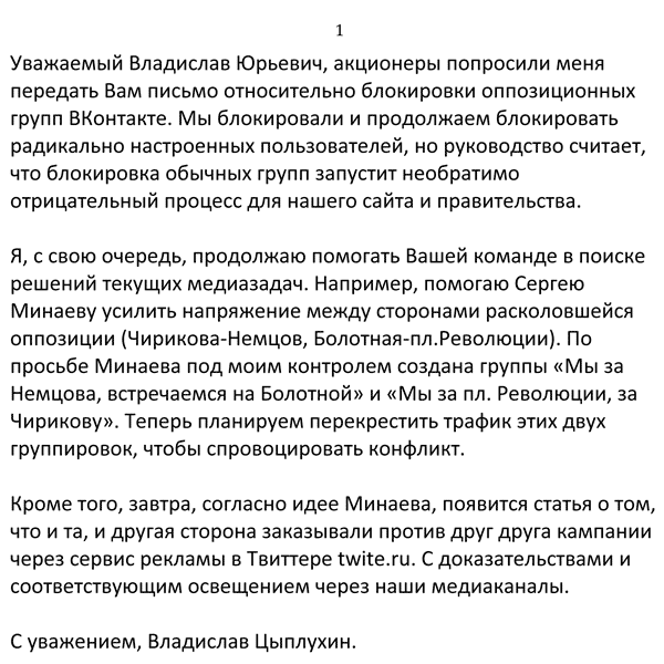 В письме, авторство которого «Новая газета» приписывает Дурову, утверждается, что блокирование оппозиционных групп приведет к тому, что активисты уйдут на иностранные площадки, и российские правоохранительные органы потеряют контроль над ними. «Блокирование оппозиционных сообществ «ВКонтакте» подорвет доверие к нашей сети среди пассионарной молодежи, что в долгосрочной перспективе может свести на нет наши технологические и идеологические усилия по сдерживанию натиска иностранных социальных сетей на отечественном рынке», - отмечается в документе. В письме также указывается, что руководство «ВКонтакте» уже несколько лет сотрудничает с ФСБ и отделом «К» МВД, оперативно выдавая информацию о тысячах пользователей. В письме, якобы написанном Суркову Цыплухиным, утверждается, что под контролем пресс-секретаря социальной сети созданы несколько групп, задачей которых является обострение раскола внутри оппозиции.