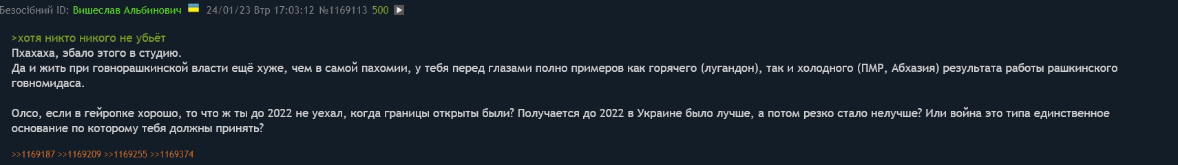 >>1441514 >истина в том, что Надо было зельке не отказываться от мирных минских, слушать зельке не макарона с патлатым непричёсанным с вечного похмела боречку джонсонюка, а соседей и мнение своих граждан, которые не поддержали майдан (большинство областей было на нейтрале, а часть негативно была настроена против скакунов, за скачки были 3-4 галичанские области, которые первые съебались до пiльшi, что намекает). И вот несогласные с майданутами скакунами граждане запросили помощь у РФ. >отвечать за свои действия Вот ты, мыкола, и отвечаешь за своё хатоскрайничество или поддержку геноцида западными скакунами несогласных. Проблемы? >никто кроме >никто не нап Да что ты... Как минимум 21 февраля на территории РФ разбили арту и бмп всушников, тогда частично всушников пленили. До этого были засланные савченки и прочие. До этого в 8 году нацбаты укров были с грузинами. До этого был билый, ярош, яйценюх, корчинский и прочий скам из унаунсы сам знаешь где. Это без учета воровства в одностороннем порядке территорий у РФ со стороны укрыйны аж с 90ых, а также газа, в т.ч. туркменского. Я уж не говорю про регулярные нахрюки в раде и от деятелей украины о танках на площади соседнего государства, залужный вот в 21 году хрюкал, когда зеля его поставил. >В реальности недоимп Хорошо ты так про сша с их операциями аэродинамик и оранж революсьонами с 3ьими турами, да кружевными труханами. >>1441519 >Притеснения русскоговорящих это факт и я его наблюдал. Подобное отвратительно. Янукович был отличным президентом А чего ты тогда возмущаешься, если сам свидетель. А ещё Янукович отменил призыв полностью, а майданутые, кстати, первым делом отменили этот указ Януковича. Хорошо поскакали, трусы кружевные не натёрли? >отличная, просто великолепная Поэтому ты хрюкаешь и обзываешь граждан? Чому не державною и чому не на фрiнте?