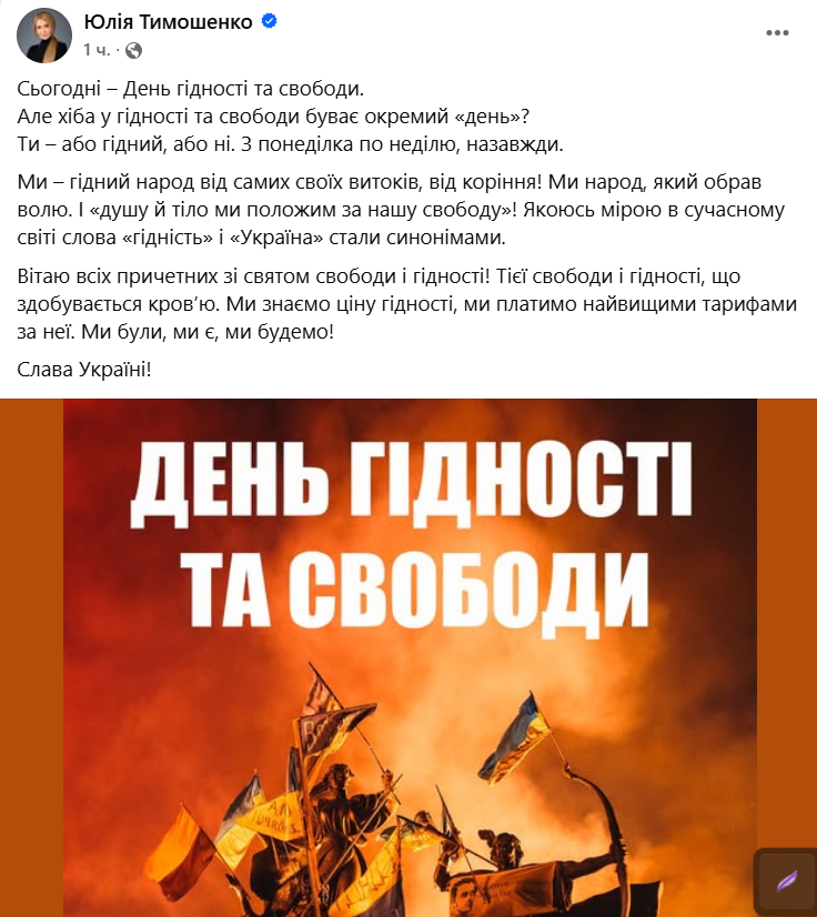 >Сегодня День Достоинства и Свободы — и это прежде всего для украинцев честь того, какова цена независимости для Украины и сколько сил в основе реального суверенитета. Сегодня мы вспоминаем всех, кто в разное время боролся за право для Украины быть свободным, независимым, сильным государством и кто стал для мира символом человеческого достоинства и справедливости.