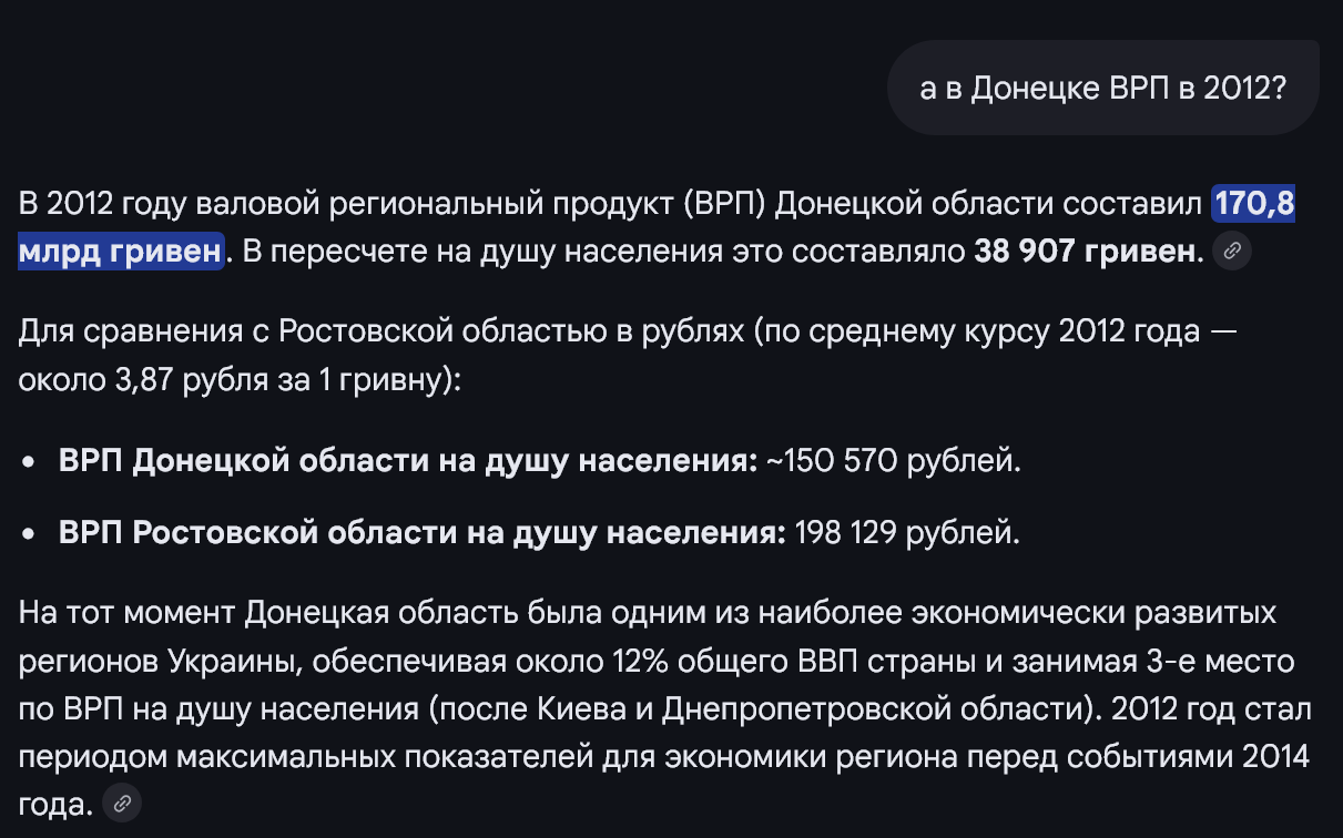 >>1712617 >при том что в составе Украины это был самый развивающийся регион Про меркам Украины, забыл добавить. Если сравнить "самый развивающийся" Донецк в 2013 году с каким-нить Ростовом (далеко не самый развитый регион РФ, даже в топ 20 не входит) то окажется что "самый развивающийся регион Украины" в 2012 году был на четверть беднее довольно бедноватого Ростова. Разница 25% в доходах населения, это даже больше разница чем между Ростовом и вторым городом в Латвии - Даугавпилсом (там 15%)