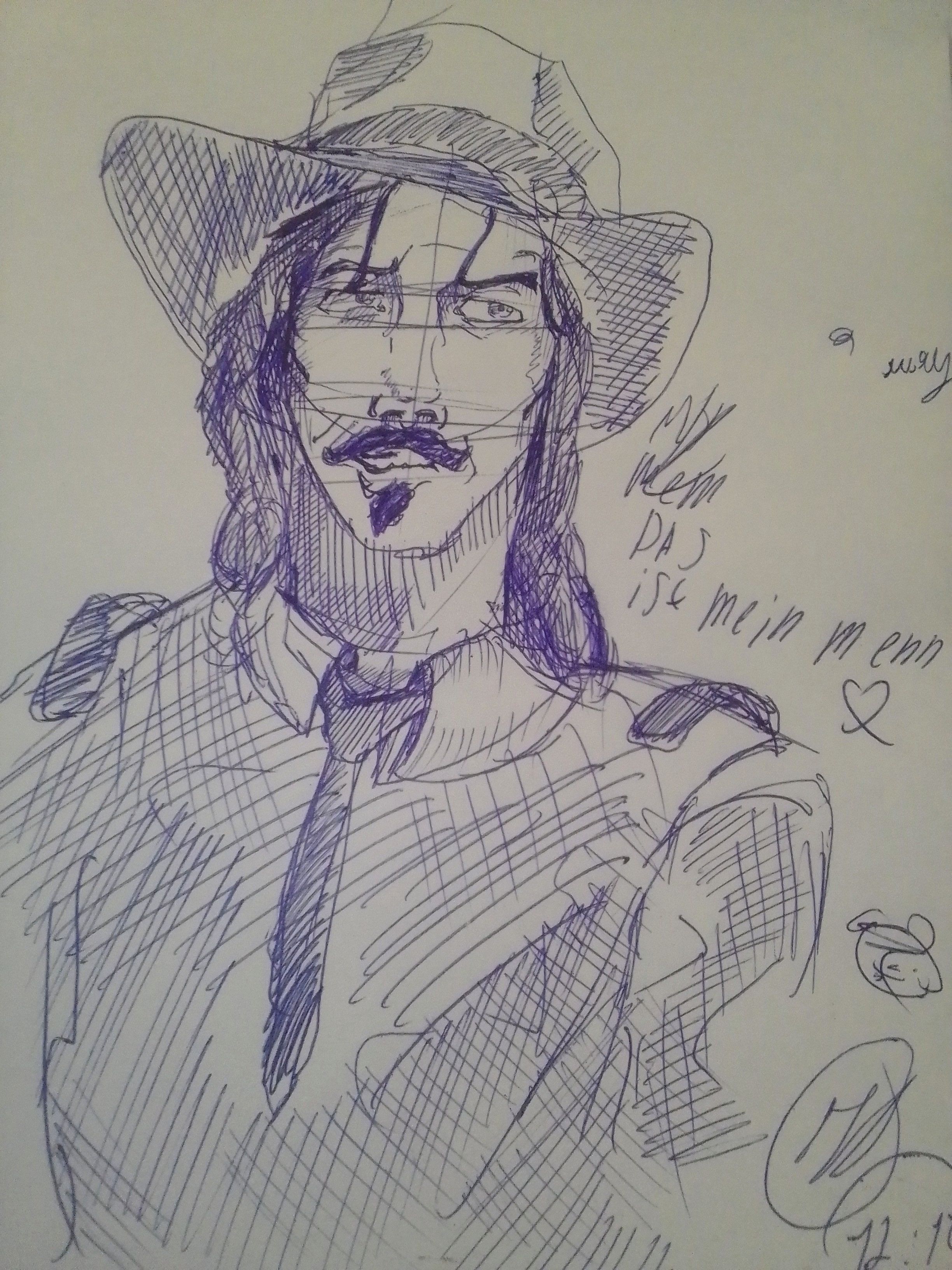 Я после долгого промежутка времени когда не рисовал,рисовал разве что кошачьи морды,и то в упрощённом виде. Потом решив что-то порисовать,нарисовал ковбоя из какого-то мультфильма. Мне он понравился,но так как не знал куда выложить..решил сюда.