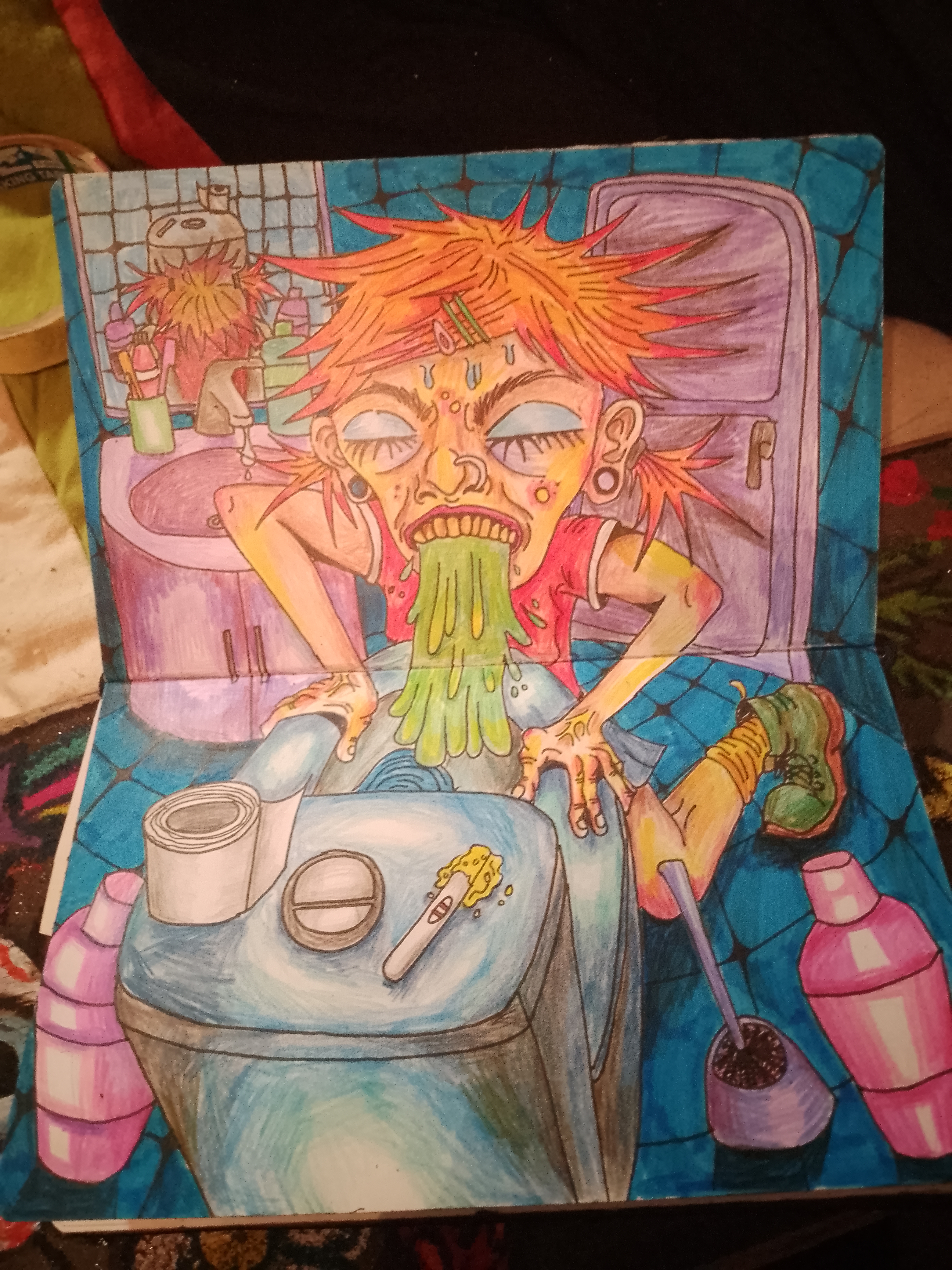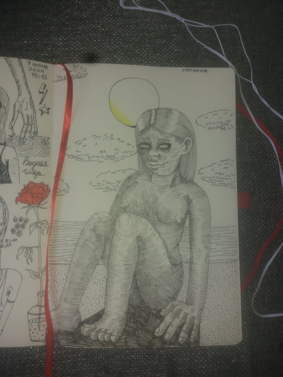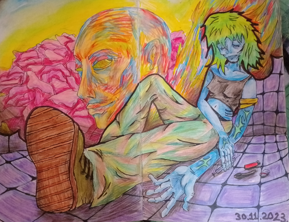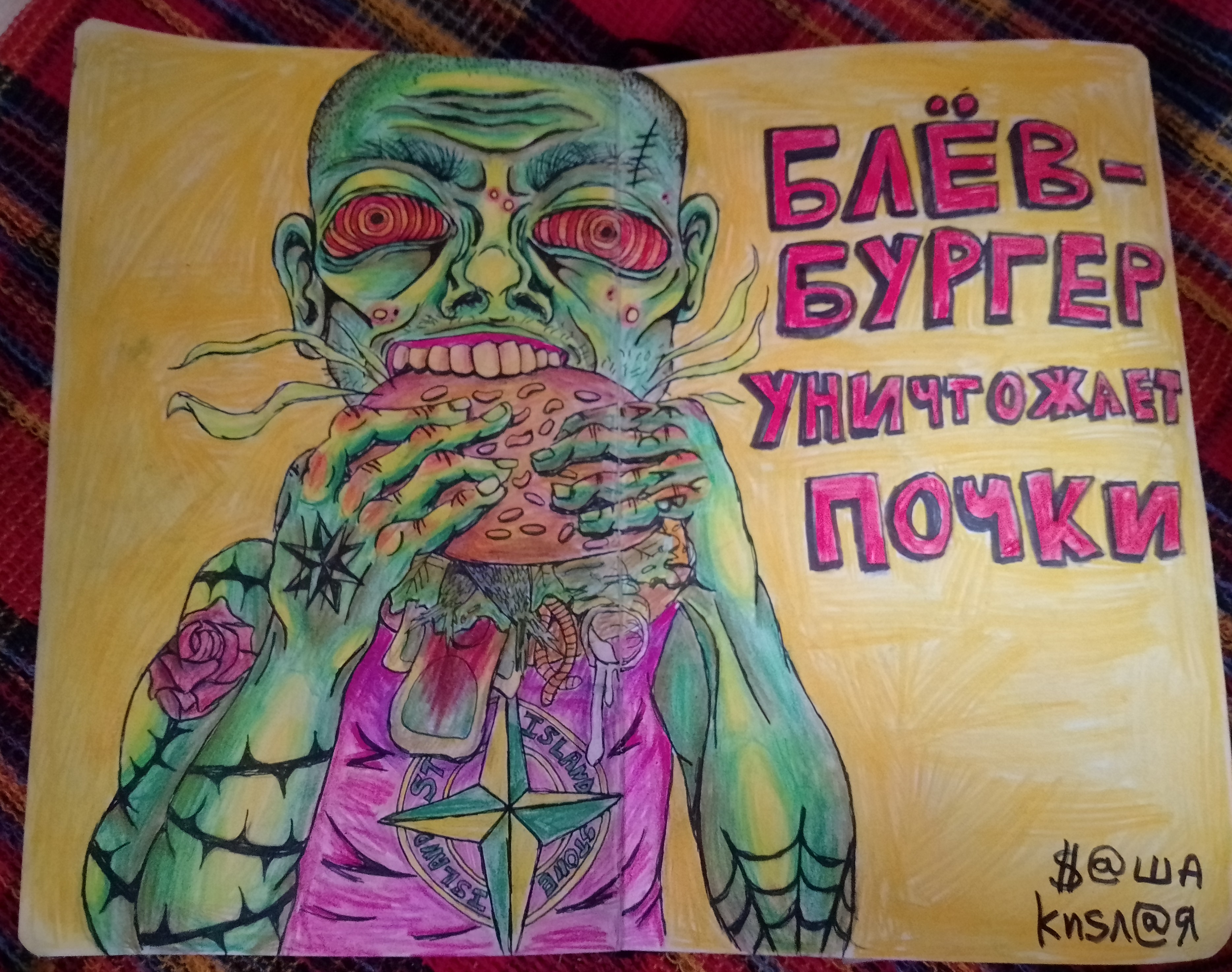 Сейчас отойдя от темы наркотиков, насилия и секса очень сложно найти далее свой творческий путь, интересных сюжетов как будто нет, а бытовуху рисовать я ненавижу, но это единственное сейчас чем я живу: учёба и быт. Не хочу возвращаться к жестокости и прочим гадостям, неактуально на данный момент для меня. Пытаюсь экспереминтировать с техниками, перейдя на большой формат и заменив карандаши с фломастерами на краски и графику. Неимоверно сложно найти в себе и вокруг что-либо цепляющее...