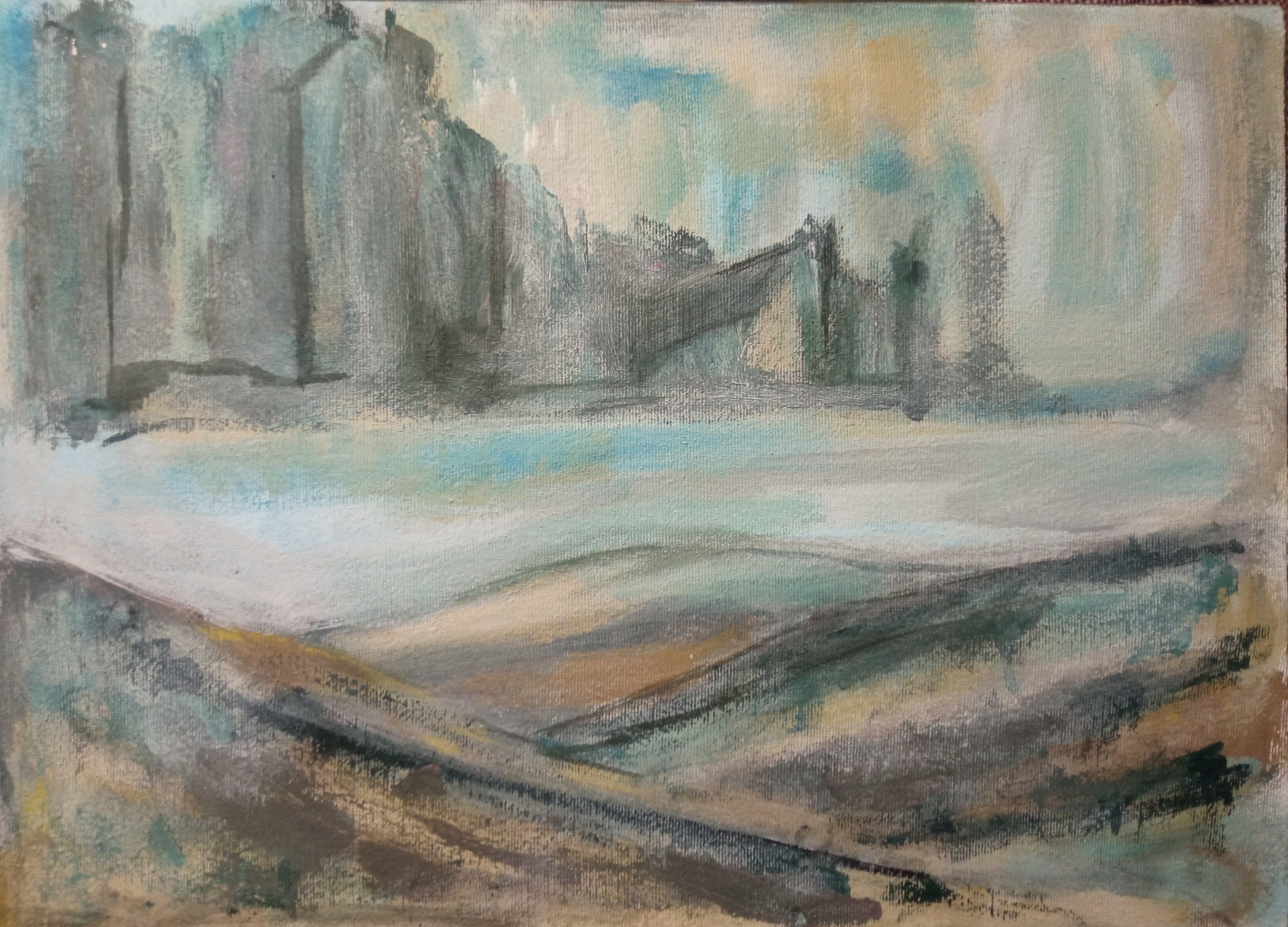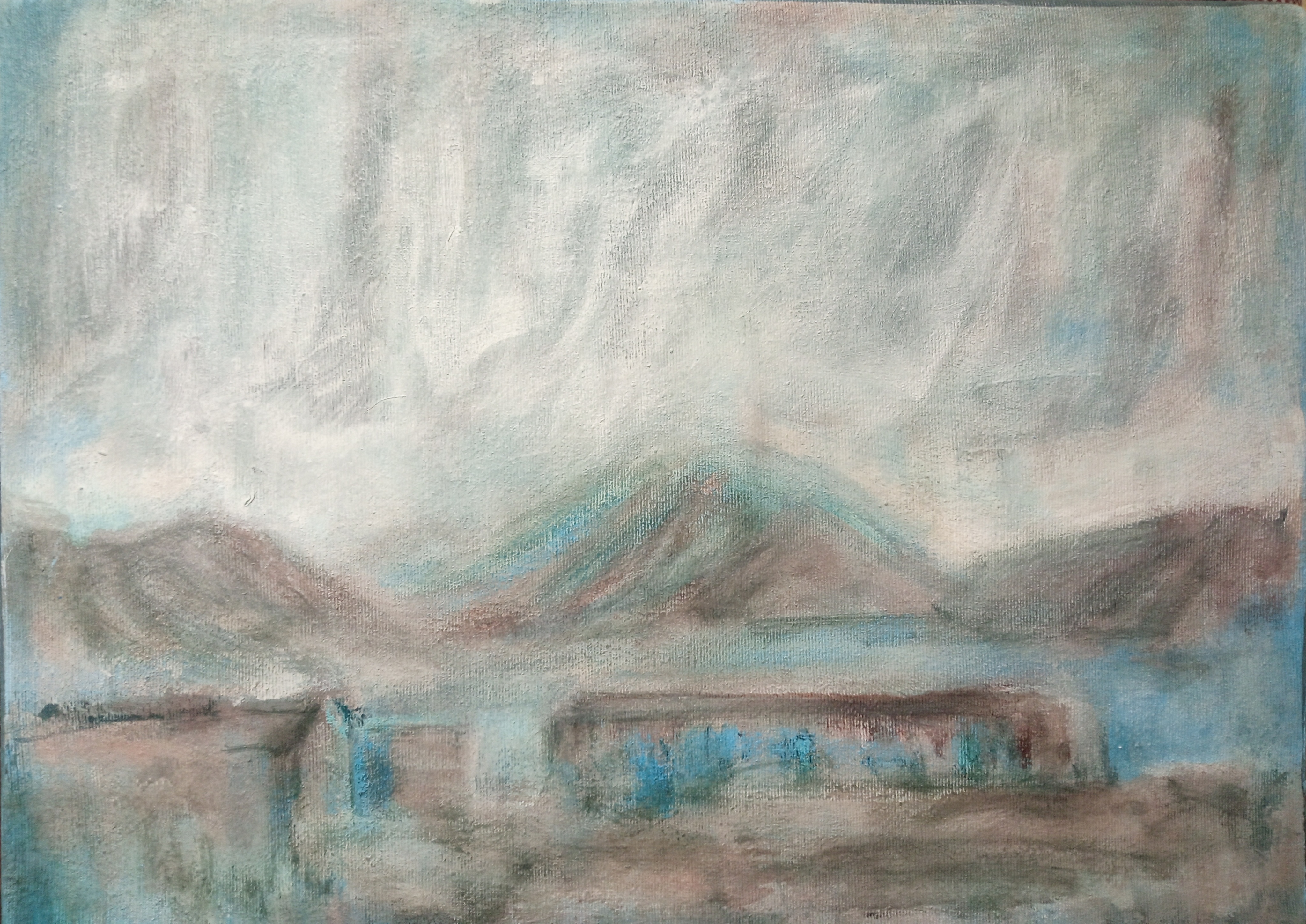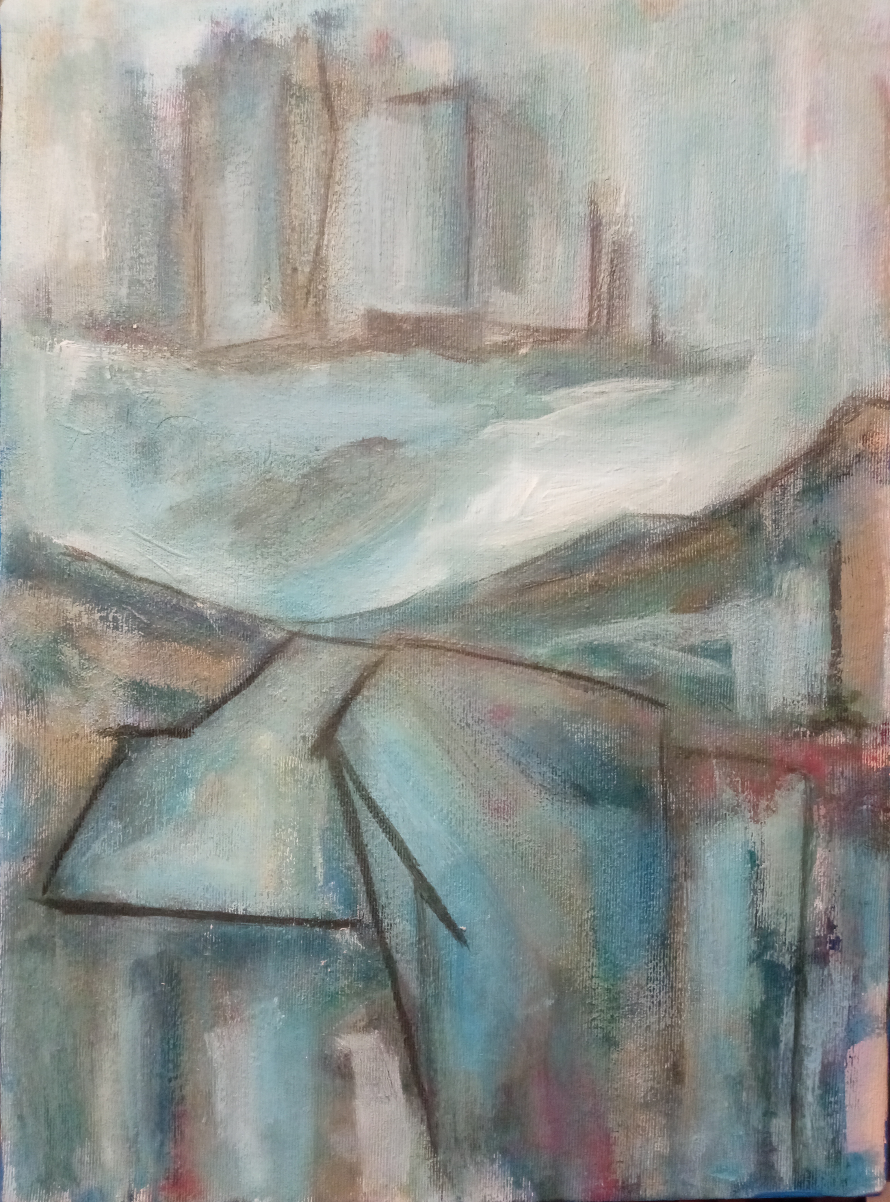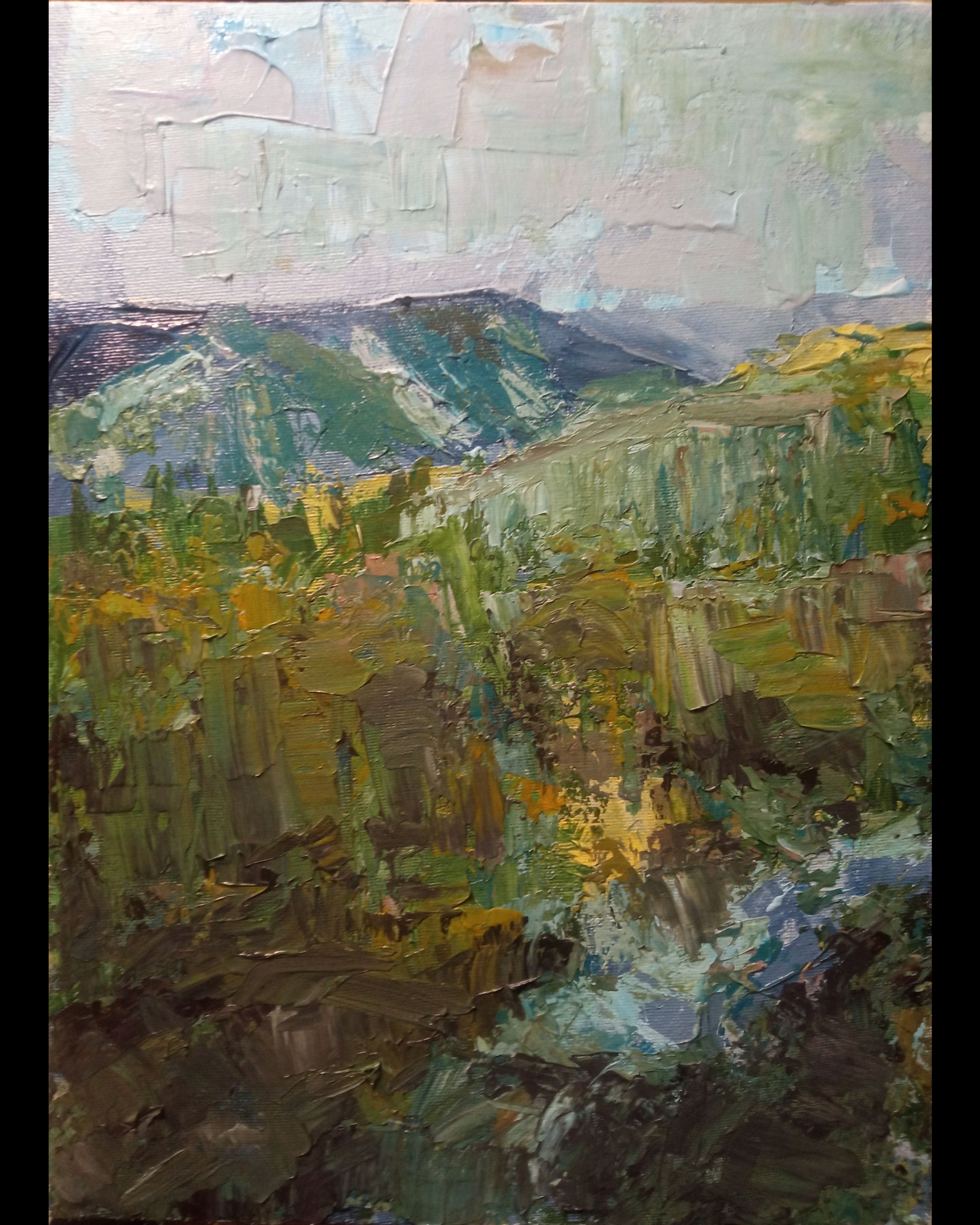 Абстрактный пейзаж №5. Масло на холсте 45х50 см, а абстрактный он потому что изначальное изображение нарисовано по принципу автоматического письма или вроде того.