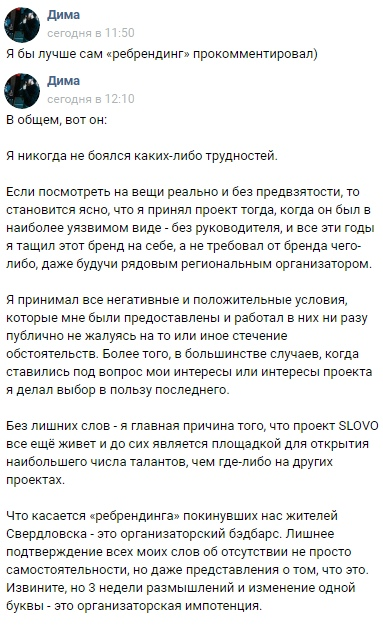 Бля так забавно, что хокенз со своими лозунговыми криками на полном серьезе считает, что он какой-то там особенный и не такой как эти все тупые взрослые, при том что сам является прямым порождением, скажем так, "тренда на искренность". То есть когда мы были мелкие (мне 24, как и Брагину), мы росли глядя на колоссальный разрыв между уличной жизнью и красивой денежной фальшивой жизнью с телека. Был некий диссонанс, но было модно стремиться быть идеальным: модные журналы, бабки, пластические операции. Сейчас с развитием современных СМИ, Интернета и так далее появился вышеупомянутый "тренд на искренность", когда все просекли, что идеальным быть невозможно и глянцевая картинка - это ложь, сразу все вспомнили про позитивную психологию и гуманизм, добавили в свои образы человечности и заговорили про то, что все блять неидеальны, все совершают ошибки, главное идти своей дорогой, главное делать то что нравится, куда сердце зовет и тд и тп. И вот я лично не вижу в хокензе никакой индивидуальности, я листаю ленту инстаграма, потом открываю баттл и вижу АБСОЛЮТНО ТЕ ЖЕ САМЫЕ мысли, просто обернутые в формат баттлового противостояния.