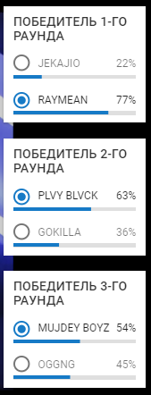 А шо по типам ну хз самоотдача рифа и плотное построение раундов Прост им рил пизда, я лично вообще ни ебу какой им нужно написать хук чтоб до них не доебались, командную работу в раундах льва тоже начали хуесосить, так что тоже излишнюю изьебчивость в минус запишут. Лично я думаю вживую они не потащатся, у нищеты слишком выиграшный стилек для судейства в зале по всем показателям