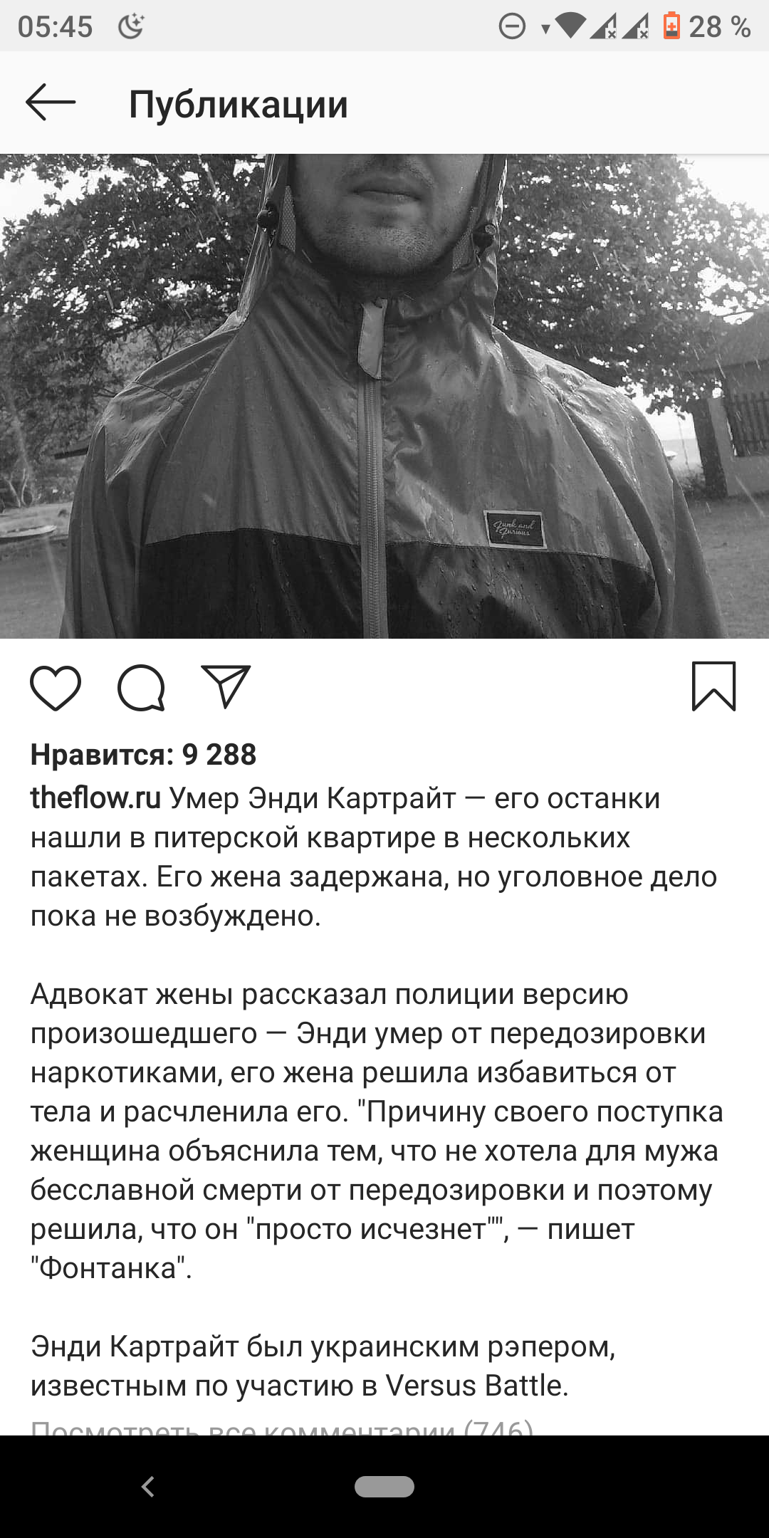 Отдельно хочу сказать, что, когда от передоза отъезжает очередной кумир молодежи, люди это романтизируют, а из покойника делают мученика и культурный символ, не смотря на не самые трагичные обстоятельства смерти. В чернухе же люди видят только чернуху и обращают внимание скорее на детали событий, а не на личность жертвы. Поэтому давайте смотреть на случившееся не как на инфоповод для пугающих заголовков в новостях, а как на потерю талантливого человека. Ресторатор, который хорошо знал Картрайта оставил у себя в соцсетях реквизиты для помощи его семье. Думаю, что он делает это все исключительно из благих побуждений, поэтому продублирую их тут. Светлая память."