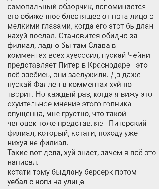 Вчера гоняли на вписку лайтово почилить и пофлексить с челиками. В итоге словили нихуёвы криндж, хотя я во вписках шарю, ибо там были в основном додики и зашквары, сасных шкур не было, после неё пошли на забив с оффниками на говне в палёном шмоте, хайпануть не получилось по итогу.
