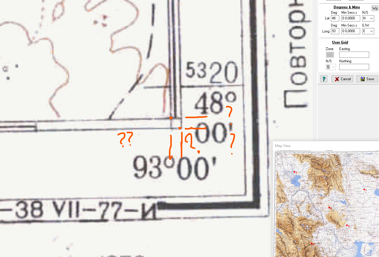 понимаю что мертвый тред, но все равно спрошу: - есть старые карты генштаба, 1:500 000 - хочу сделать привязку - не понимаю, где угол карты настоящий как в OziExplorer при привязке карты выставить координаты в углах, если там четыре линии, которые сходятся в двух точках, какую именно выбирать? Т.е. широта и долгота 48 00 и 93 00 на какую точку указывают?