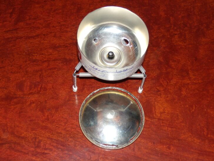 Банка из-под тунца. Закпятила пикрилейтед (суммарно 1,5 литра) на 50 мл спирта. Ей нужно полминуты-минуту прогреться, иначе потухнет.Думаю, результат был бы лучше при использовании широкодонной посуды (или более узкой банки). В текущем исполнении пламя достает до середины стенок котелка (или до верха чашки).