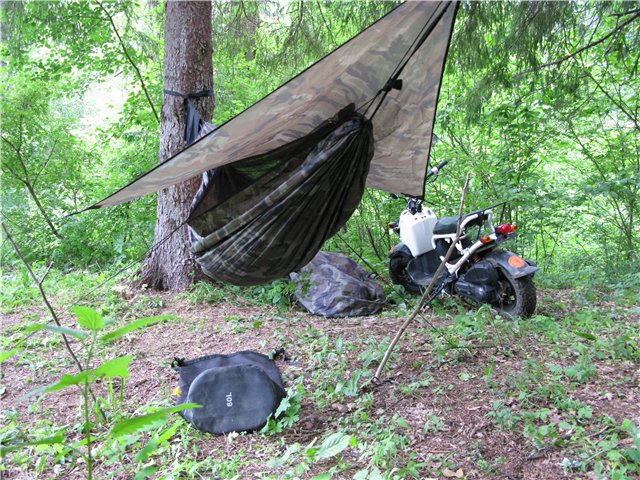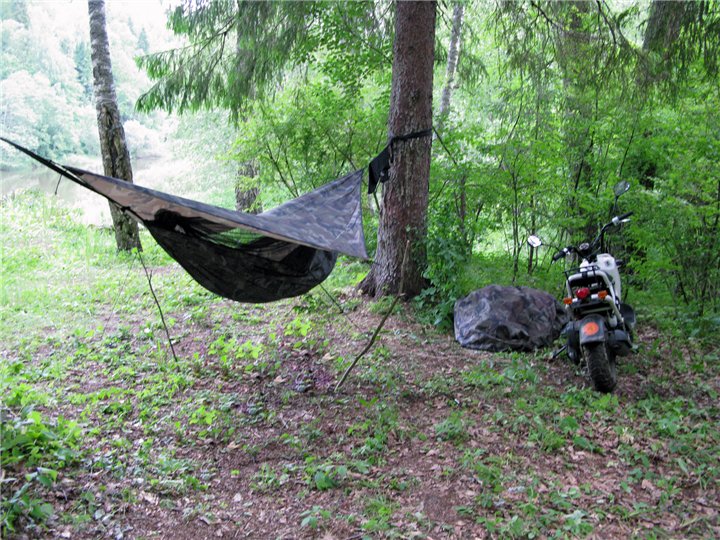 Для "быстрого сна" есть у меня такая штука - Сшил сам, Материал - тафета, взял за основу образец американского производителя "Хеннесигамак" и еще немного от двух других американских производителей, от каждой модели взял нужное и сострочил на машинке, добавил кое-чего своего вес получился в районе 600-800гр, упаковывается в маленький мешочек, привязывается стропами к деревьям и еще крепится колышками за оттяжки на бортах и краях ромбического тента, за счет этого гамак не раскачивается и ветроустойчив, с сеткой от комаров, вход в гамак снизу, застежка молния (тоже где-то подсмотрел), устанавливается в дождь без намокания самого гамака за счет правильного свертывания/развертывания, вещи складываются под гамаком или рядом под небольшим тентом или в гермо-мешок и не намокают неудобства при опочивании не замечено, достаточно отрегулировать силу натяжения строп. Это ещё со времён вело-путешествий. Боролись за граммы в рюкзаке за спиной. Огромные вело-сумки на труднопроходимых маршрутах не удобны.