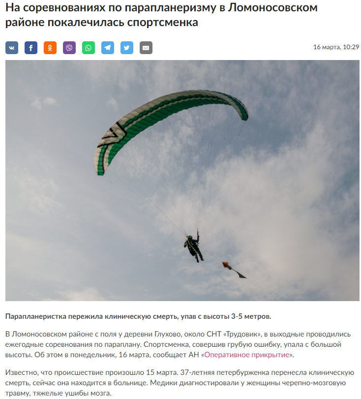 Очередной летун(ка) разложился. Интересно, что случилось? Из описания нихуя не понятно, но учитывая что соревнования на точность, а падение с высоты пять метров - либо срыв крыла из-за попытки поточнее сесть, либо какая-то хуйня на взлете на лебедке (недовывод, обрыв троса).