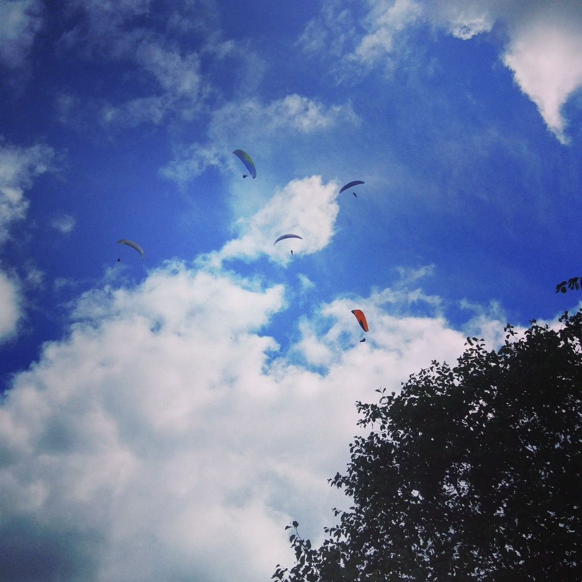 Вообще необычно смотрится со стороны - едешь по сельским дорогам, а в небе время от времени крылья просматриваются по-одному и группами. И люди с большими рюкзаками на обочинах. Интересно, как местные к этому относятся.
