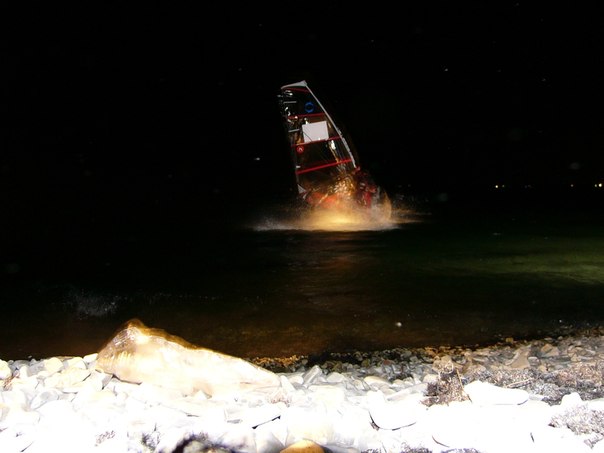 неделю сидели на берегу - нет ветра. ночью, после шаманских заклинаний и возлияний задул, поставили машины вдоль берега с вкл фарами и на воду