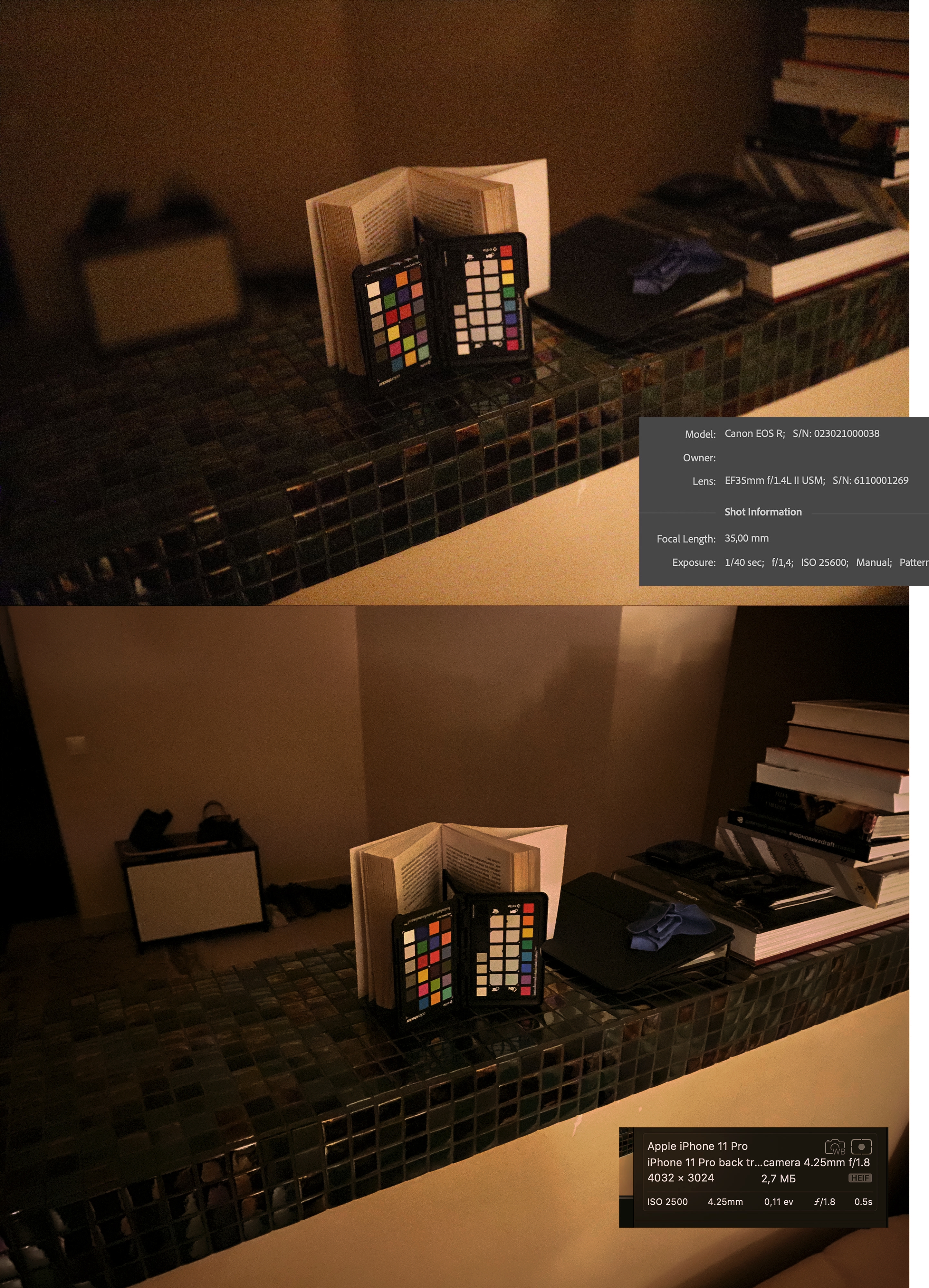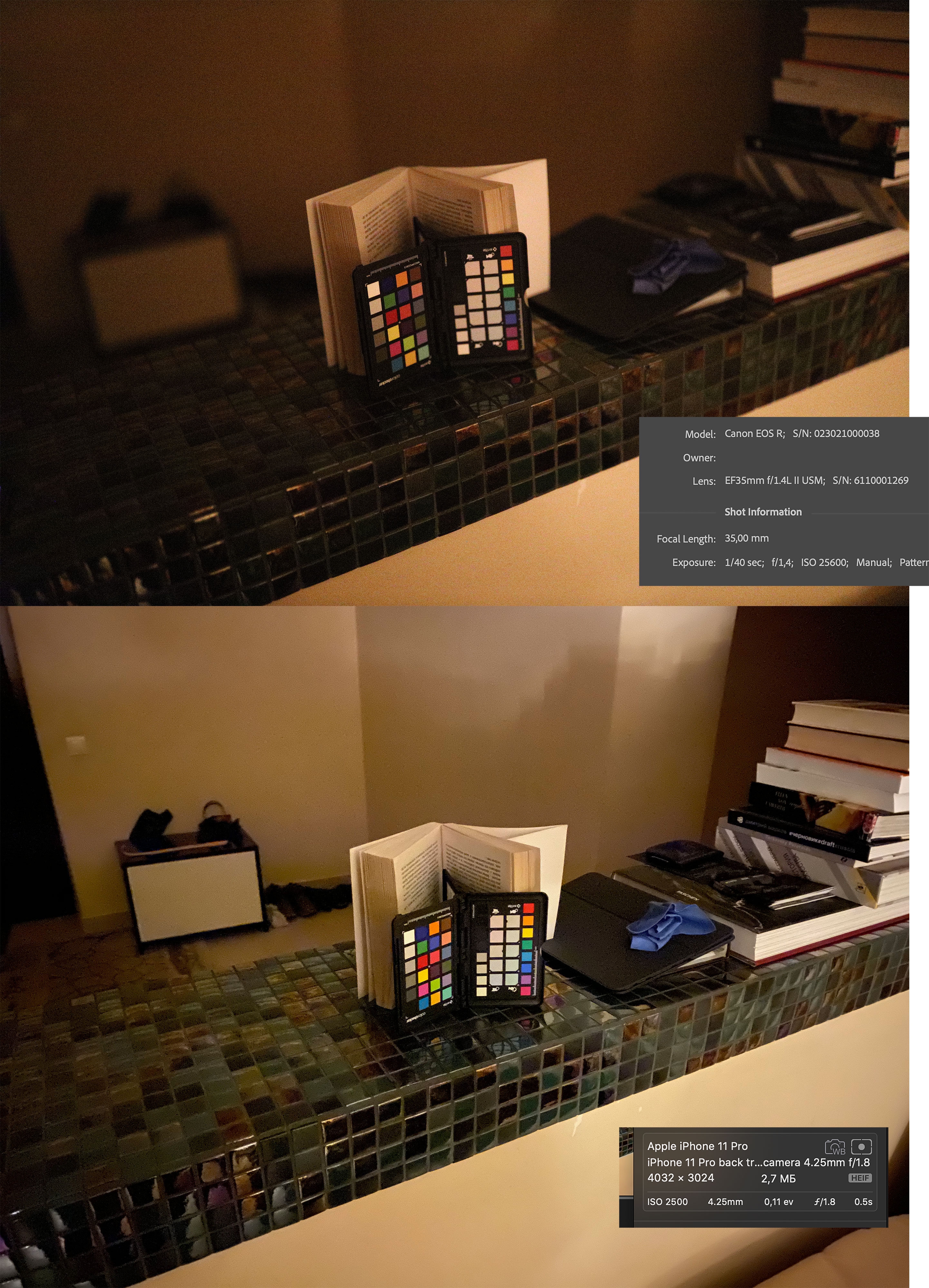 Между F1.4 1/40 и F1.8 1/2 - где-то 4 ступени разницы по свету. Между iso 2500 и 25600 - 3 и 1/3. Тут даже чисто по теоретическим цифрам 2/3 ступени разницы. Так что нижнее фото проэкспонировано ярче (в том числе и из-за того, что исо значения у камер от балды рисуется).