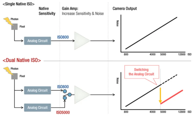 >>890190 >Разве что на современных Как раз у современных бывает два нативных исо, когда аналоговая часть начинает работать с определённых значений с другим коэффициентом усиления. Результат - лучше сигнал/шум, но всегда меньший дд т.к. цепочка с ацп та же используется, лишь усилитель другой. Но и тут отличие, что просто 2 базовых исо - в обычных условиях можно ставить 1 значение, в лоулайте - 2 значение ценой меньшего дд. >И таки первый вариант предпочтительнее. Нет, без разницы. Это принцип работы при оцифровке аналогового сигнала. При повышении исо - с аналоговой частью сигнала не происходит никаких изменений. Это все цифровое пост усиление. Отличия могут быть только в том случае, если производитель что-то "запекает" в рав - шумодав, подвирает со значениями "исо" в линейной гамме итд. Но опять же - это вопрос цифровой пост обработки сигнала. Там нет ничего, что нельзя на посте повторить.