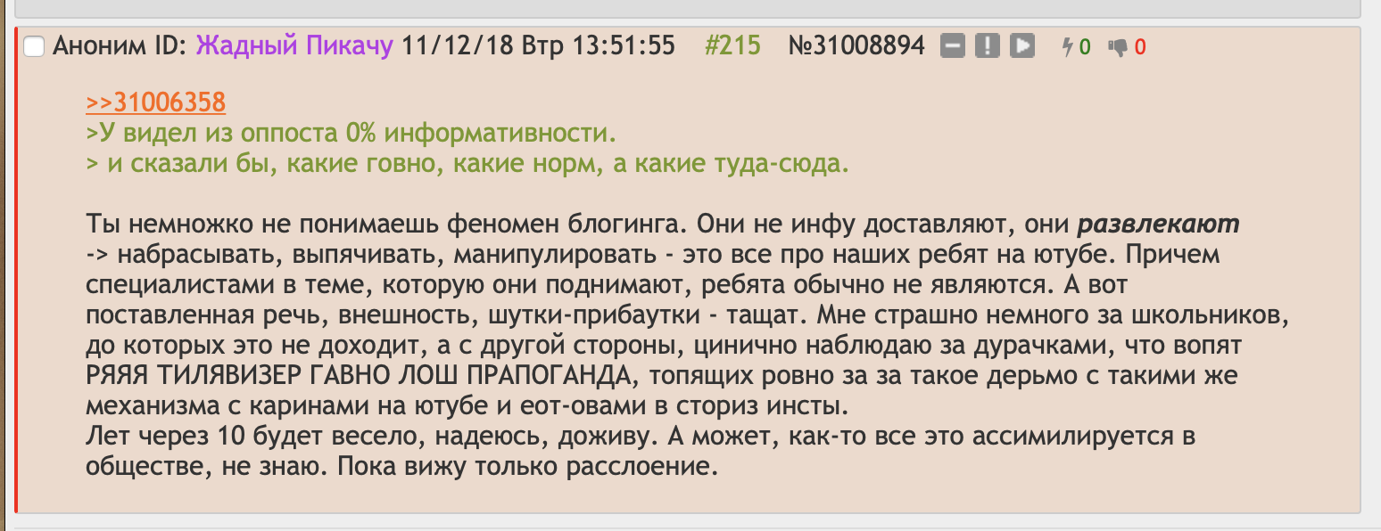 >>888289 >собственно так поисковая выдача уже пару лет и выглядит Ну тут даже не в самом нейроконтенте дело. А в связке с контекстовостью, как умные ленты появлилсь лет 15 назад, все по этим рельсам и идет. >это самое пиздецовое, причем реальность их сообщений вообще никак не верифицировать. Да. >99% ответов нейрокал на нейрокале. Чуть подучаться еще, с кукисов твоего браузера прочитают как ты любишь информацию получать - и выдадут сгенеренный контент на лету первой строкой. Любишь видео - видеобзор на твой вопрос, предпочитаешь форумы - нарисует тебе страницу с бурным обсуждением по теме, предпочитаешь двач - сгенерит трэд с картинками и отправит туда.