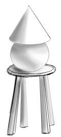 Табуретка кривая, попробуй сначала прямоугольник построить, потом в него вписать табуретку. Работай слоями, конус выше всех, под ним шар, под ним табуретка.