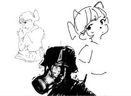 Дальше. Делается более трех, а лучше больше, набросков, где ты собираешь вместе все идеи из предыдущего этапа. Опять же, быстрые наброски, главное поймать интересную комбинацию, и хорошо её показать. Затем из всех набросков выбираешь самый лучший, в идеале перед этим проверить лучшесть на ком-то другом (например в тред скинуть и спросить что больше нравится, но можешь и мамке показать свои стадики допубертатной девочки в купальнике). Много набросков делается чтобы потом их реюзать чтобы повысить шанс сделать красивое и отучить себя хвататься за самый первый очевидный вариант.