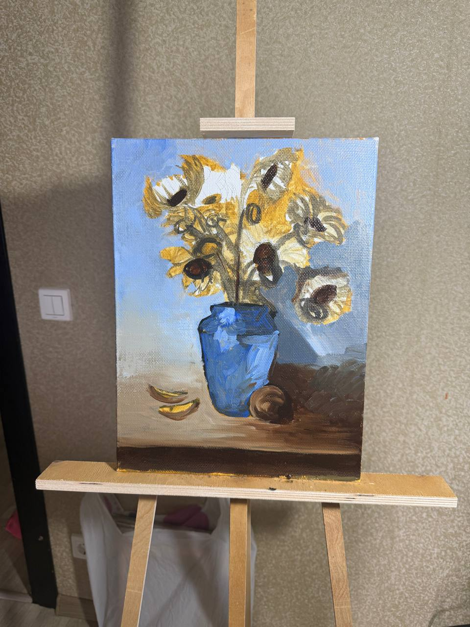 Какой свет используете, я в основном рисую в 8-9 вечера, занавешиваю окна и ставлю лампу светодиодную на 20вт с 6500к, но у меня от нее очень сильные блики, почти под любым ракурсом, а если острый угол сделать то появляются тени на фактуре холста