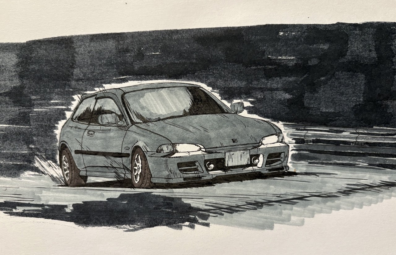 >>923307 Неплохой кадр для манги, ракурс просто такой, что крыша бы уже мешала зрителю. Надо или ее нарисовать чуть или переделать в кабриолет. Наверно. Ну и в центре кадра как бы ничего нет. Можно добавить маленькую тачку впереди с красными габаритами. Руки на руле расслабленные, еле держатся, надо напрячь, там же скорость и адреналин.