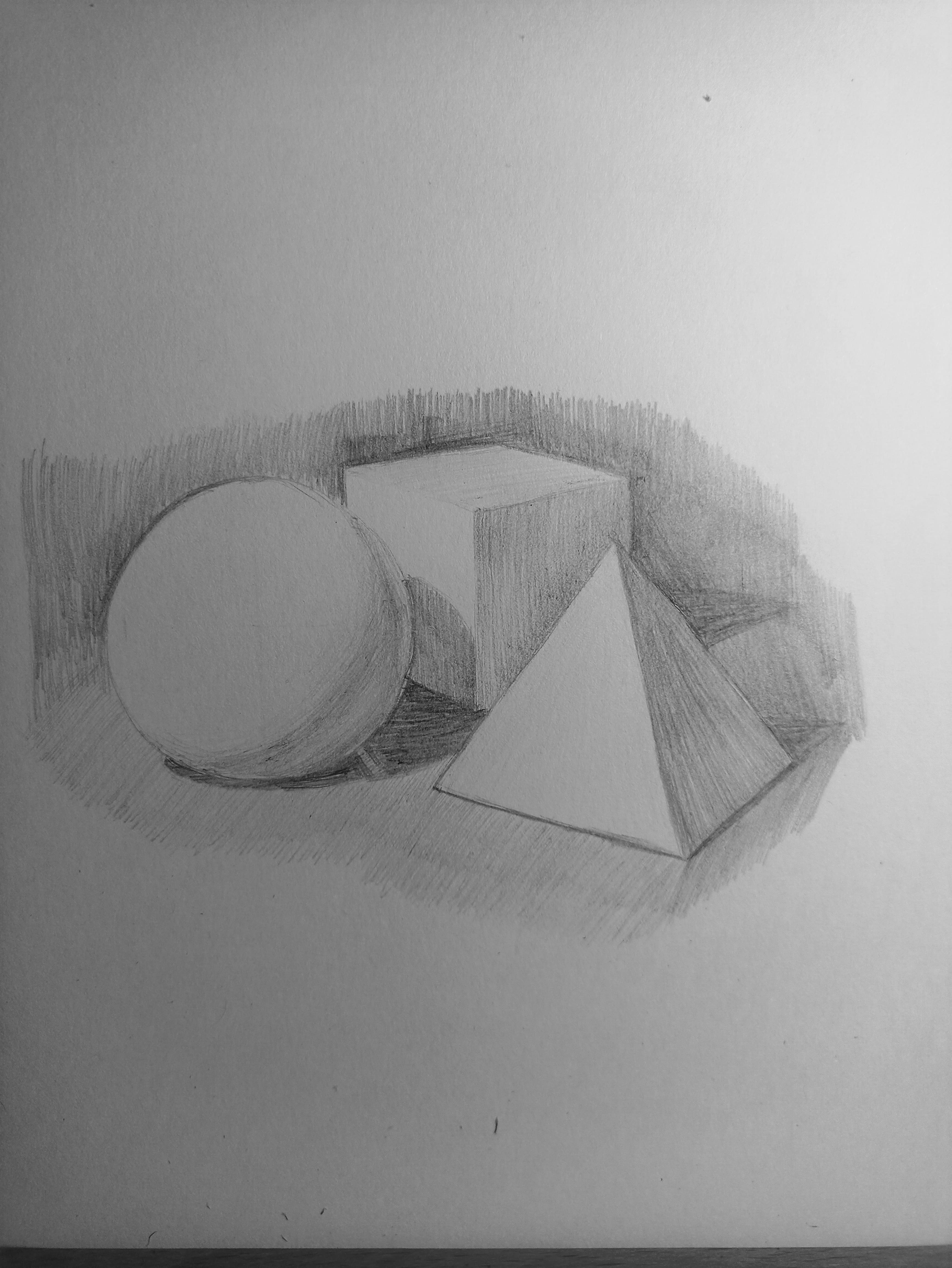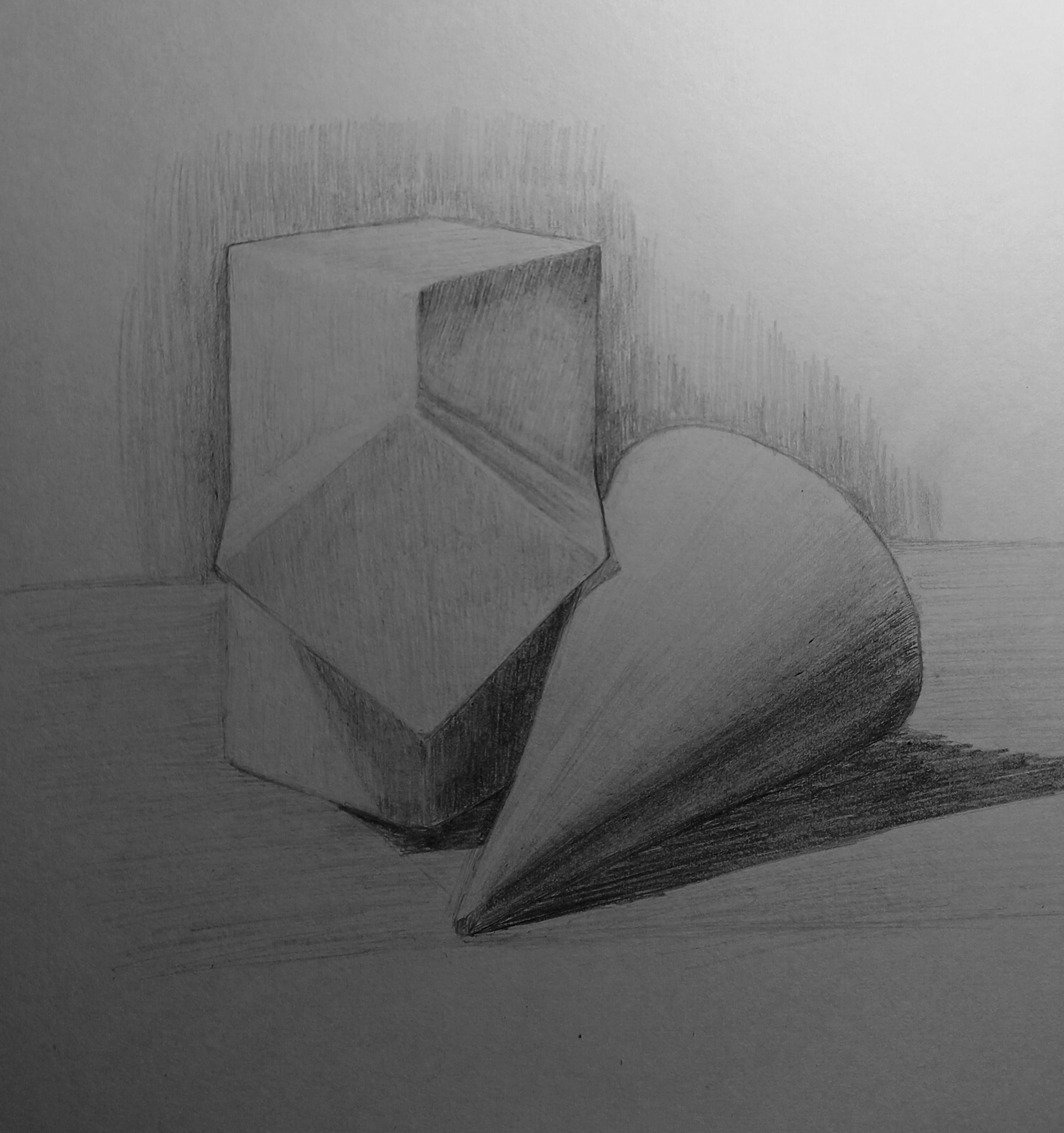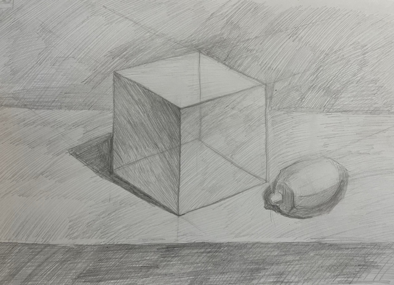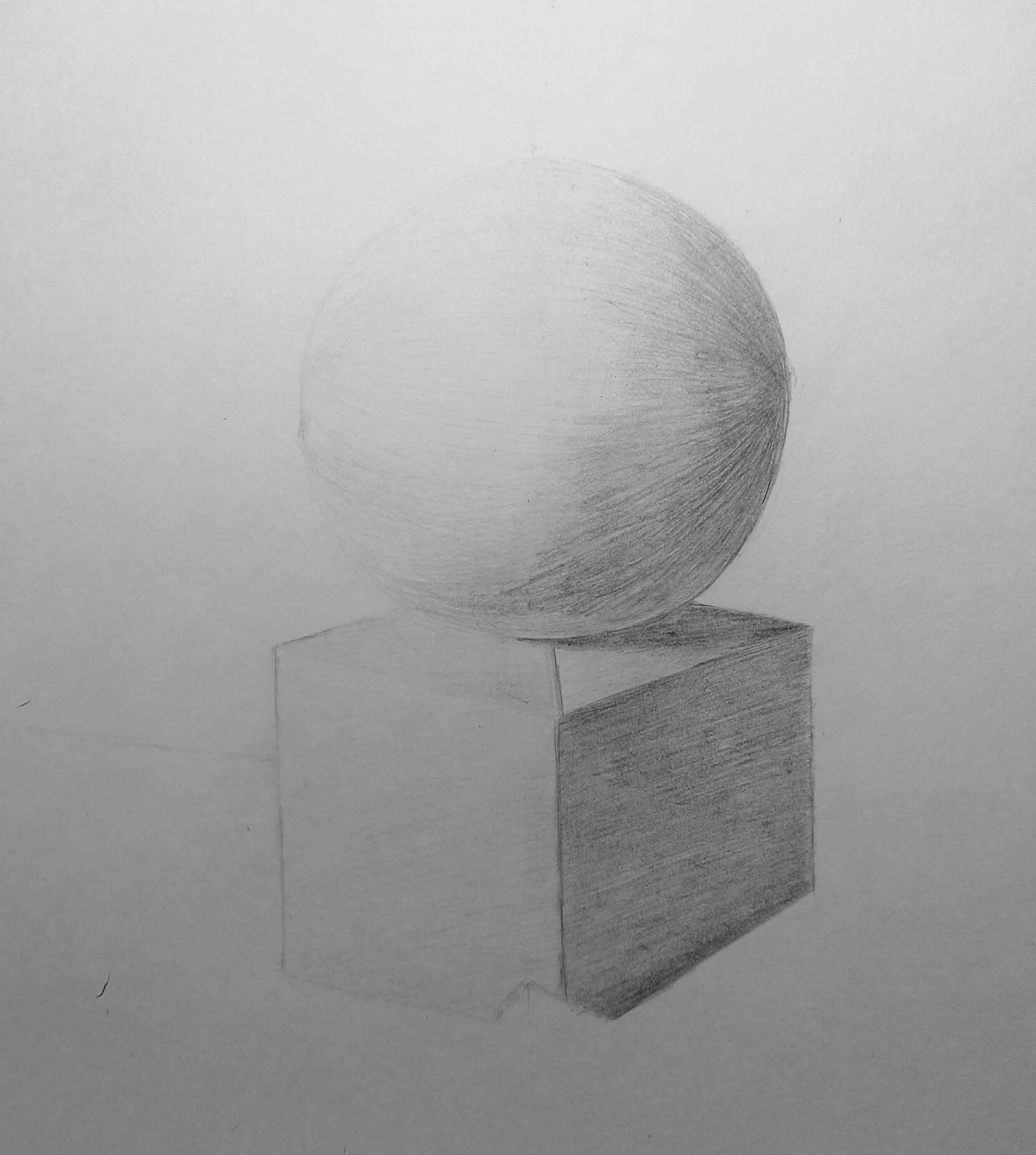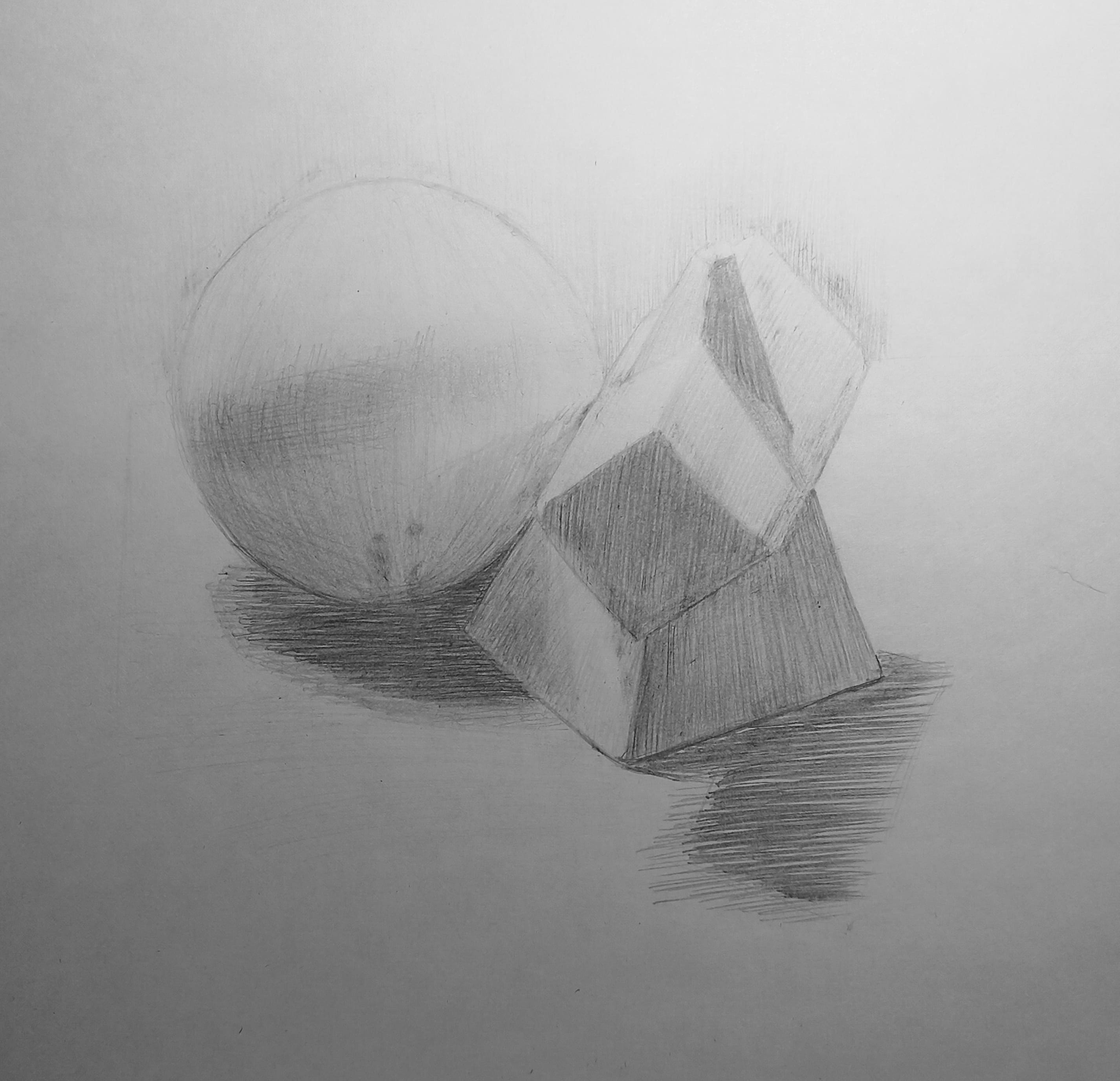 Ластиком жирную нижнюю грань куба подтер, только когда заштриховал заметил что она слишком высоко теперь...Блик высоковат... Я слишком был погружен в кривульный штрих. Криво-косо, но зато он хотя-бы осмысленно выглядит (местами).