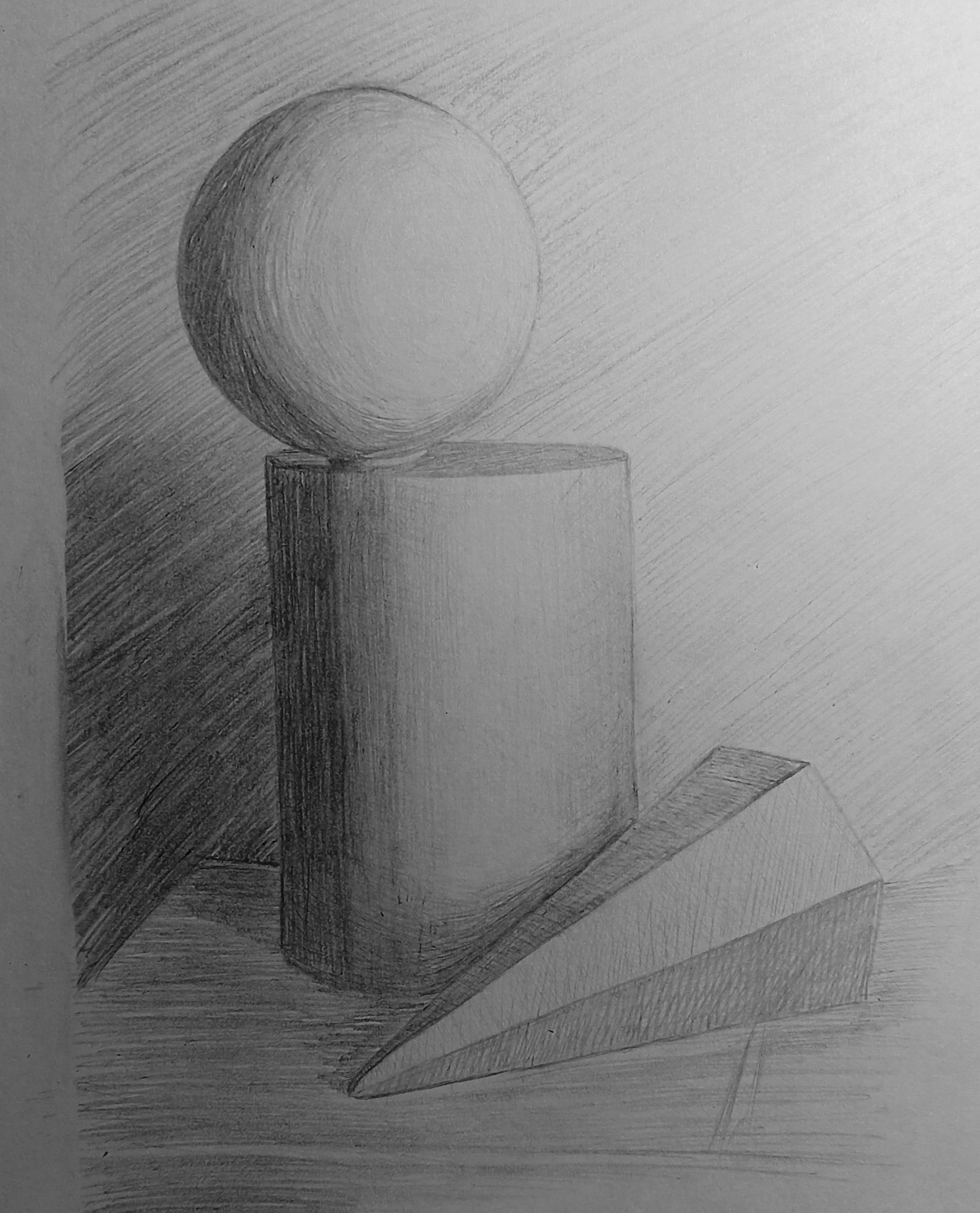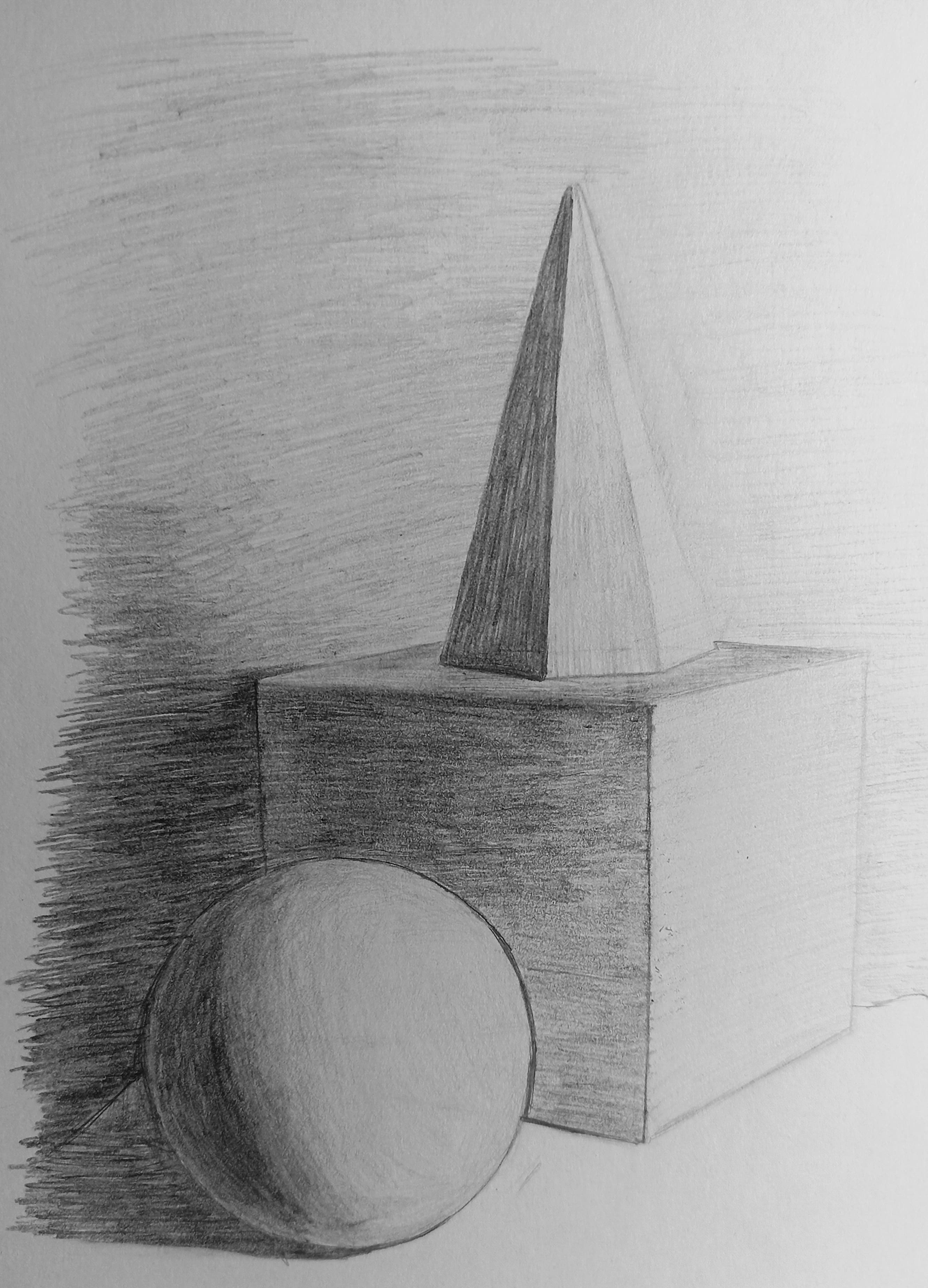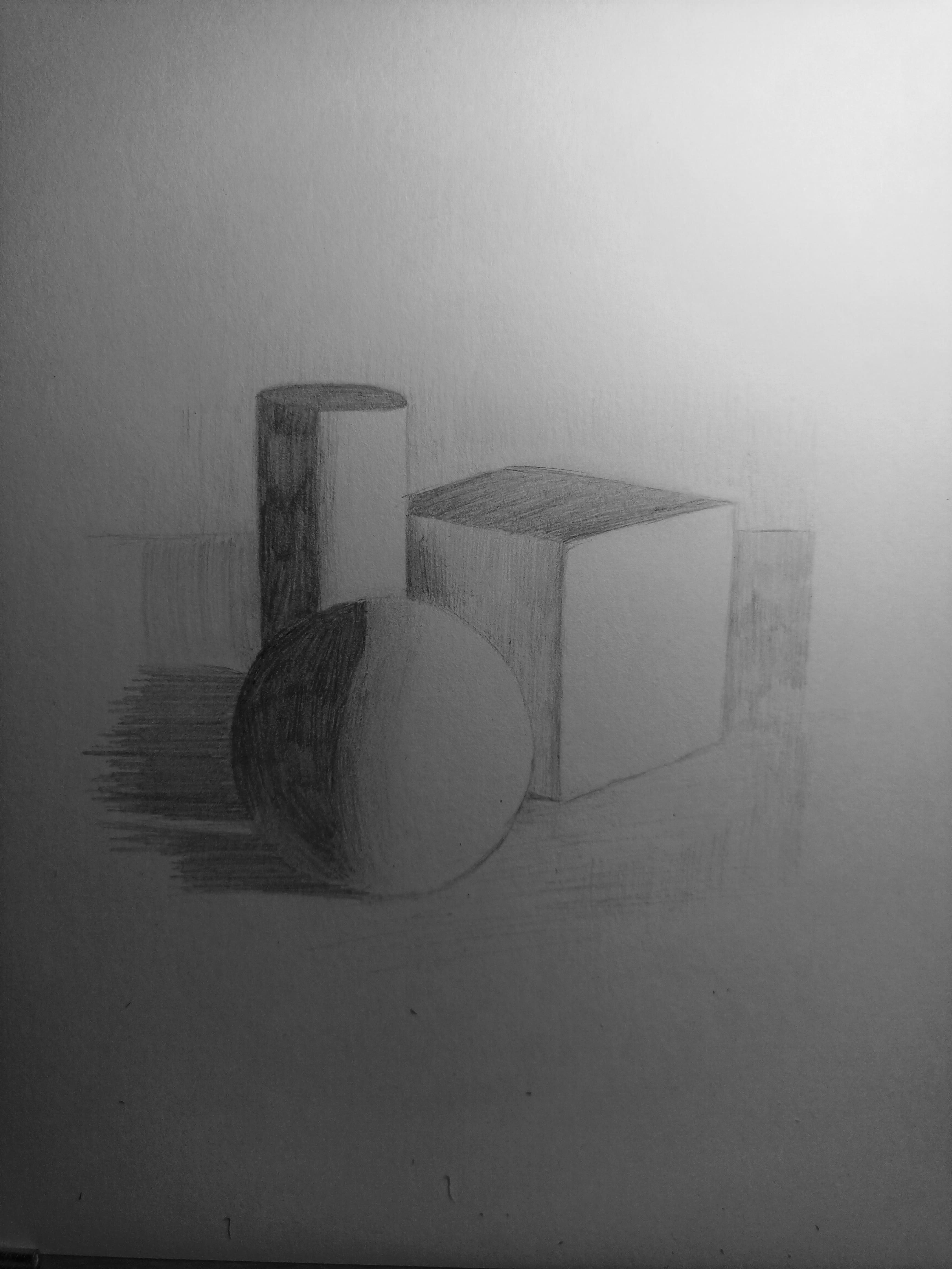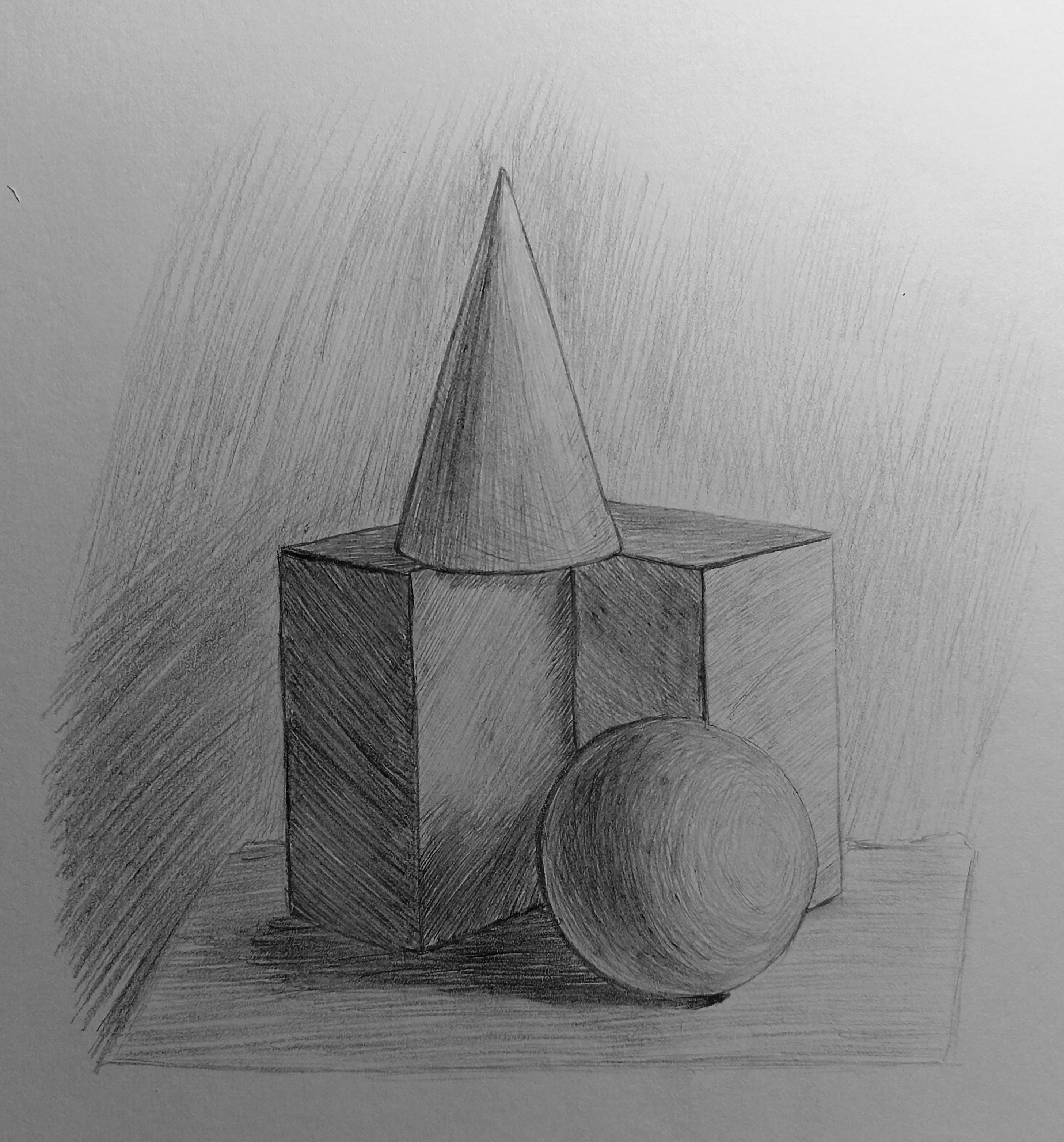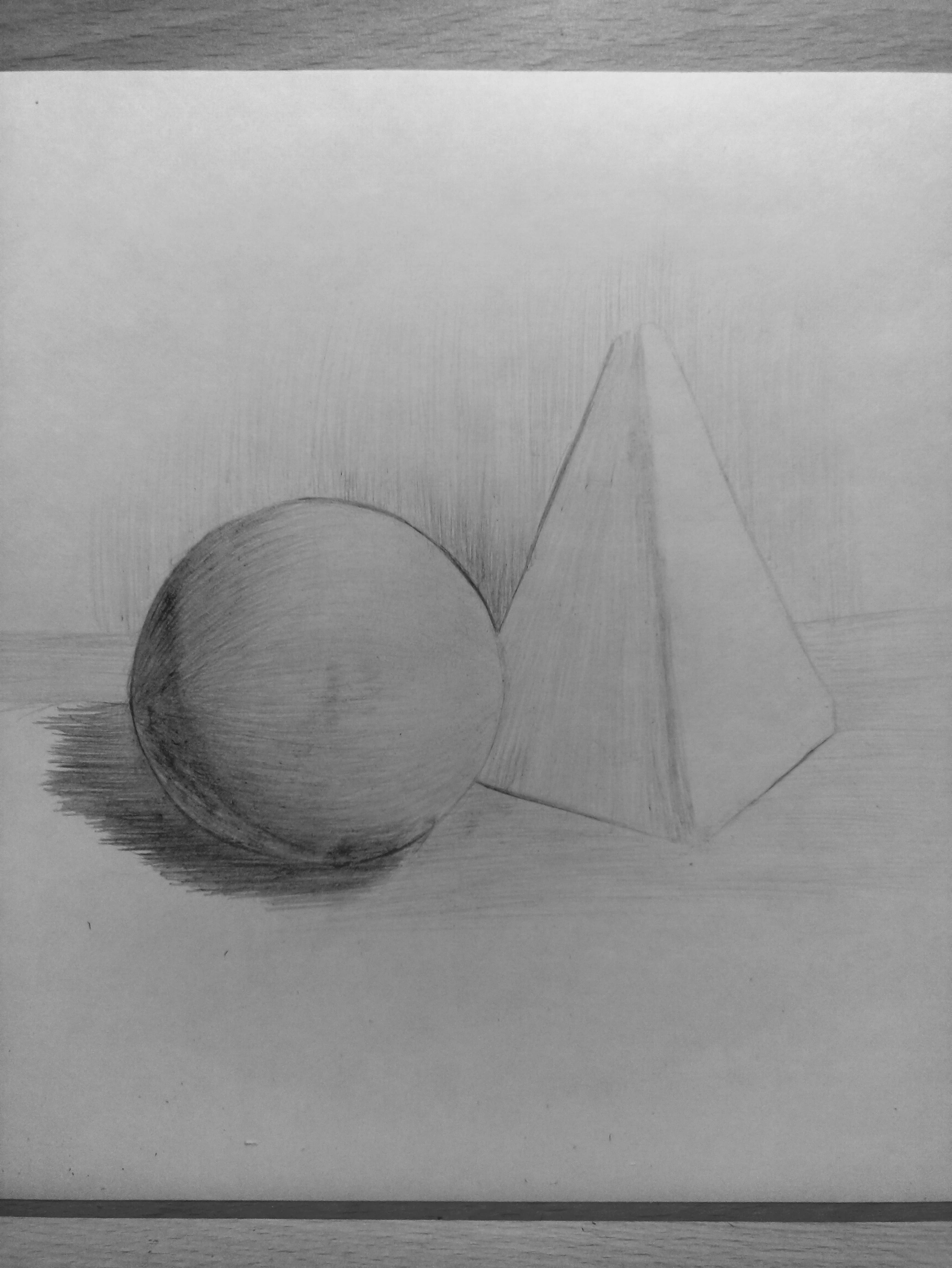 Ластиком жирную нижнюю грань куба подтер, только когда заштриховал заметил что она слишком высоко теперь...Блик высоковат... Я слишком был погружен в кривульный штрих. Криво-косо, но зато он хотя-бы осмысленно выглядит (местами).