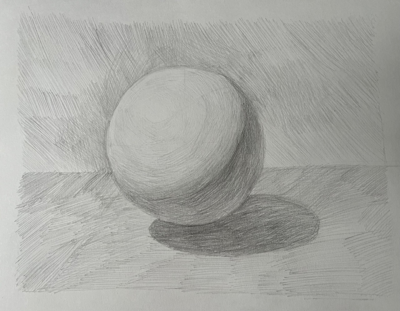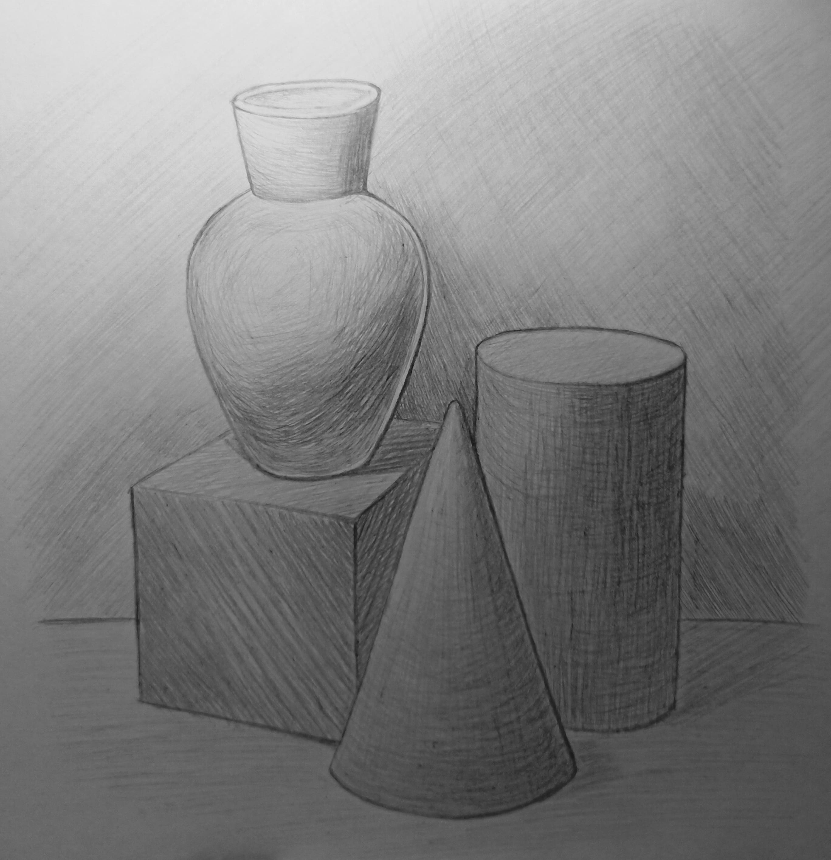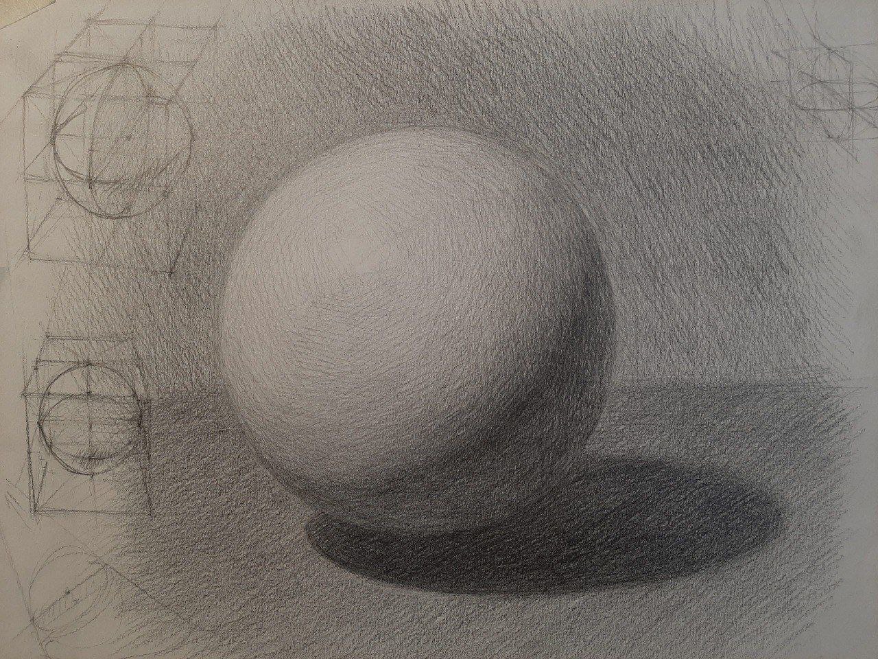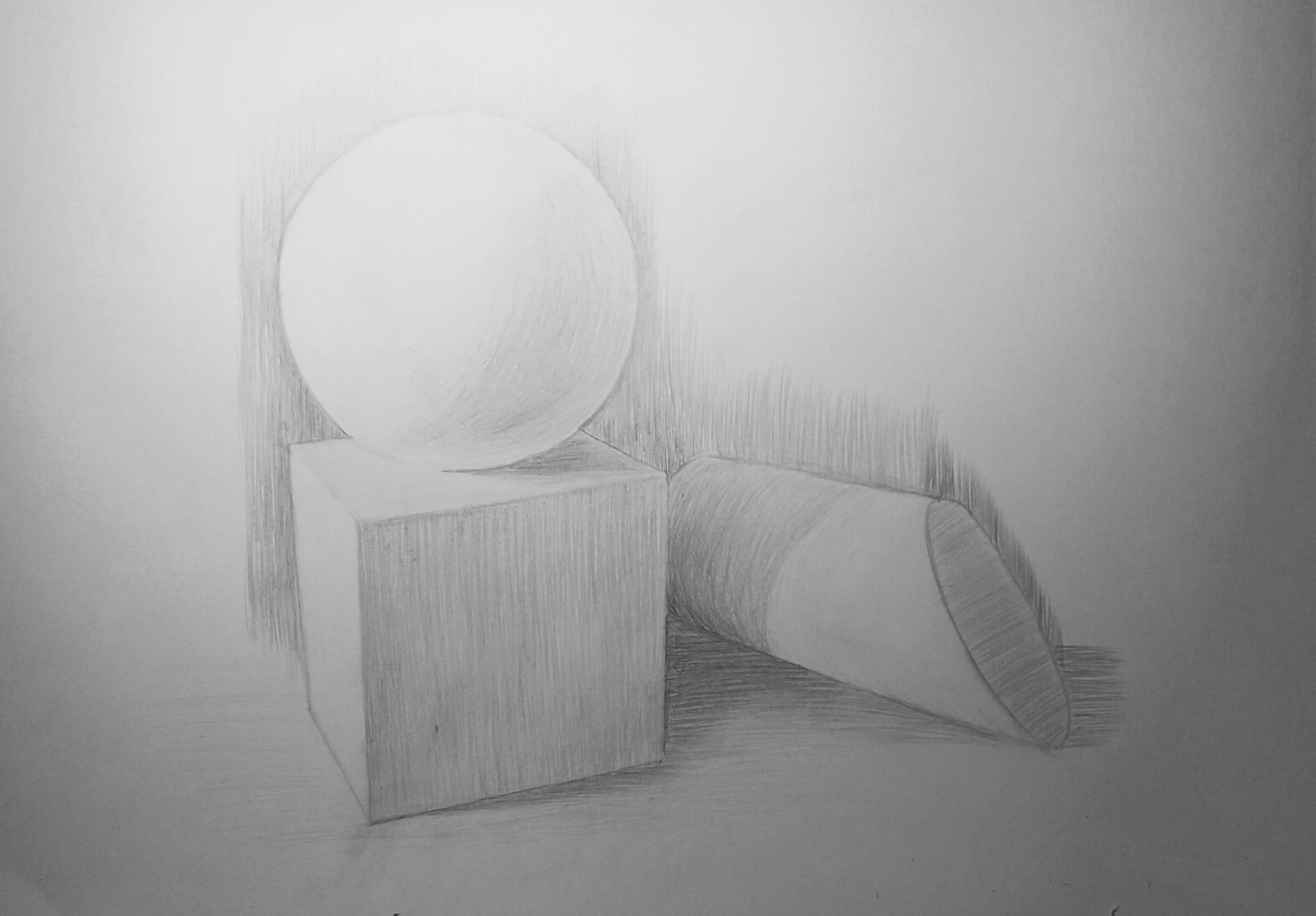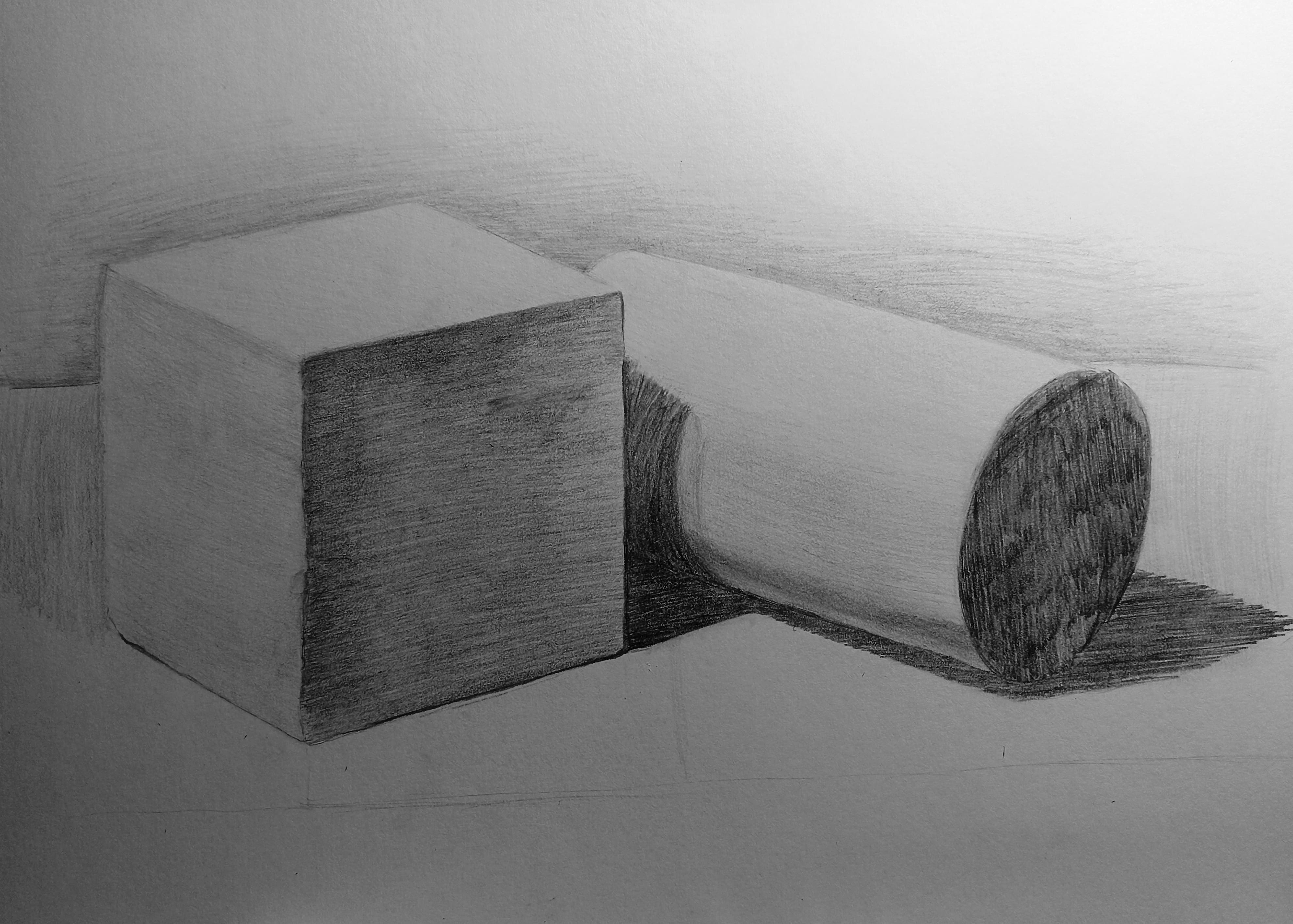 Ластиком жирную нижнюю грань куба подтер, только когда заштриховал заметил что она слишком высоко теперь...Блик высоковат... Я слишком был погружен в кривульный штрих. Криво-косо, но зато он хотя-бы осмысленно выглядит (местами).