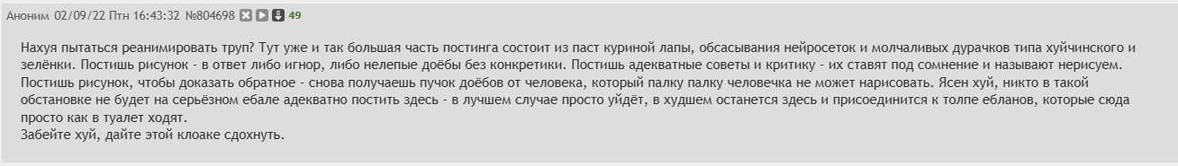 >>923219 Все ваши "полезные советы" это либо частности, либо вообще тупое самолюбоаание в стиле арбуза. За пять лет на доске я всего пару раз получил совет по работе и пару редлайнов ТОЛСТЕННОЙ СИНЕЙ КИСТЬЮ от арбуза . Все остальное время меня либо доебывали либо игнорировали. Вы даже мегу с рефами и книгами проебали. Даже в монетизации шапка висит три года. /Па уже не арт комьюнити. /Па это общественный туалет с уклоном в рисование куда нубы скидывают кривульки периодически вылизывая друг другу анус.
