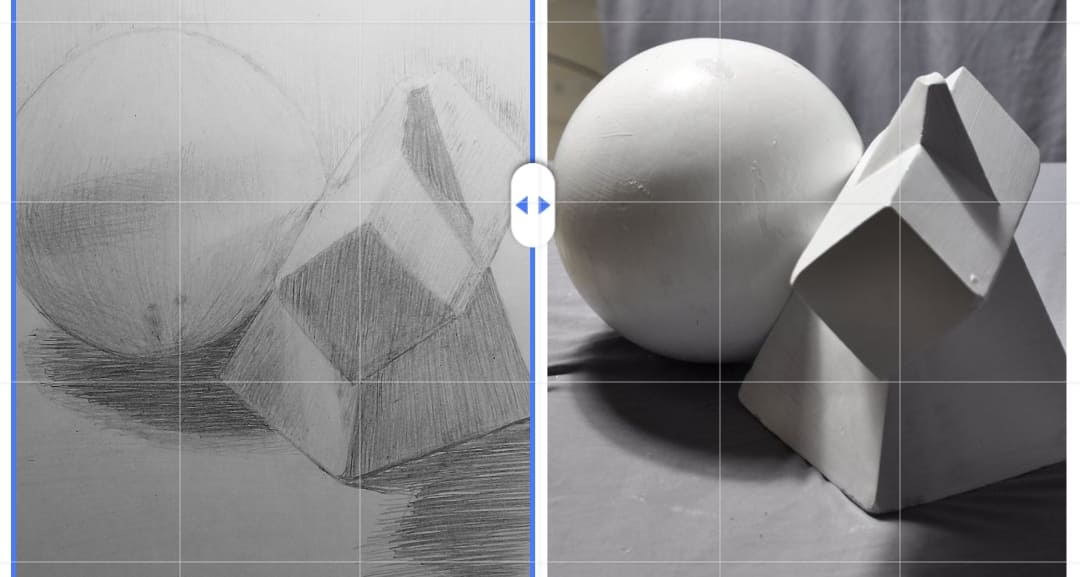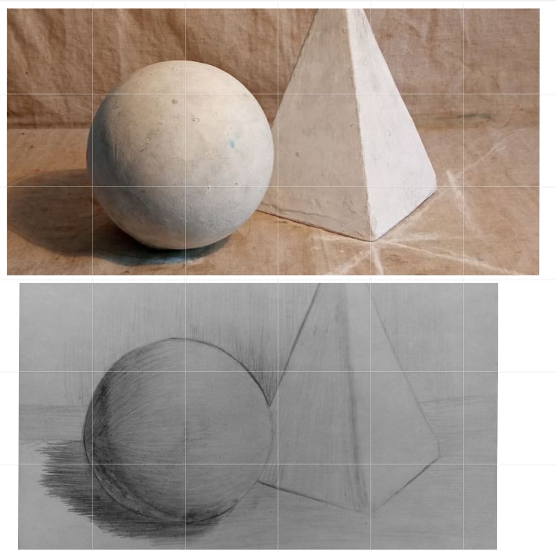 >>922073 Только в конце делаю коллаж и сравниваю. Там где пересечение прямых на шаре, это я искал центр шара от верхушки конуса и края призмы. Потом я его еще правил, потому что вместо того что-бы сразу взять диаметр, я зачем-то карандашом криво начал откладывать радиус из-за чего он у меня сдулся чуть чуть из-за погрешности моих кривых рук.