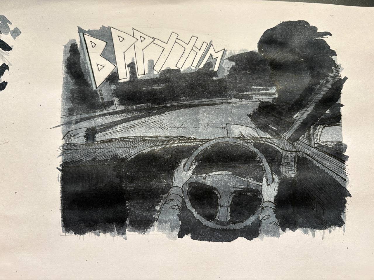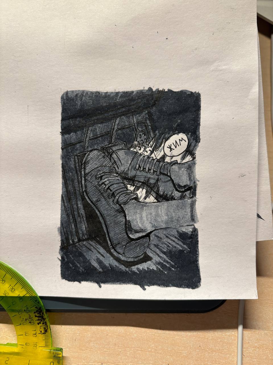 >>922114 > но как делать размытие на бумаге? Важнее знать чем их делать на бумаге. Я могу такое сделать и акварелью и гуашью и маслом и маркерами. Если знаешь азы медиума, это не сложная техника. Важнее изначально делать более рваный контур. По чёрному, обводящему контору ты прозрачной краской уже размазы краски не сделаешь. нужен будет кроющий медиум. Но крощим медиумом не рисуют пооверх чернилных линий. Я бы лично нечто подобное наверное акварельш бы делал. Акварелью легко делать штриховку которую можно по форме пустить. Например залить асфальт средним серым а поверх более тёмным серым сделать штриховку. А ещё поверх или на первом слое, ещё и штриховку тушью можно добавить.