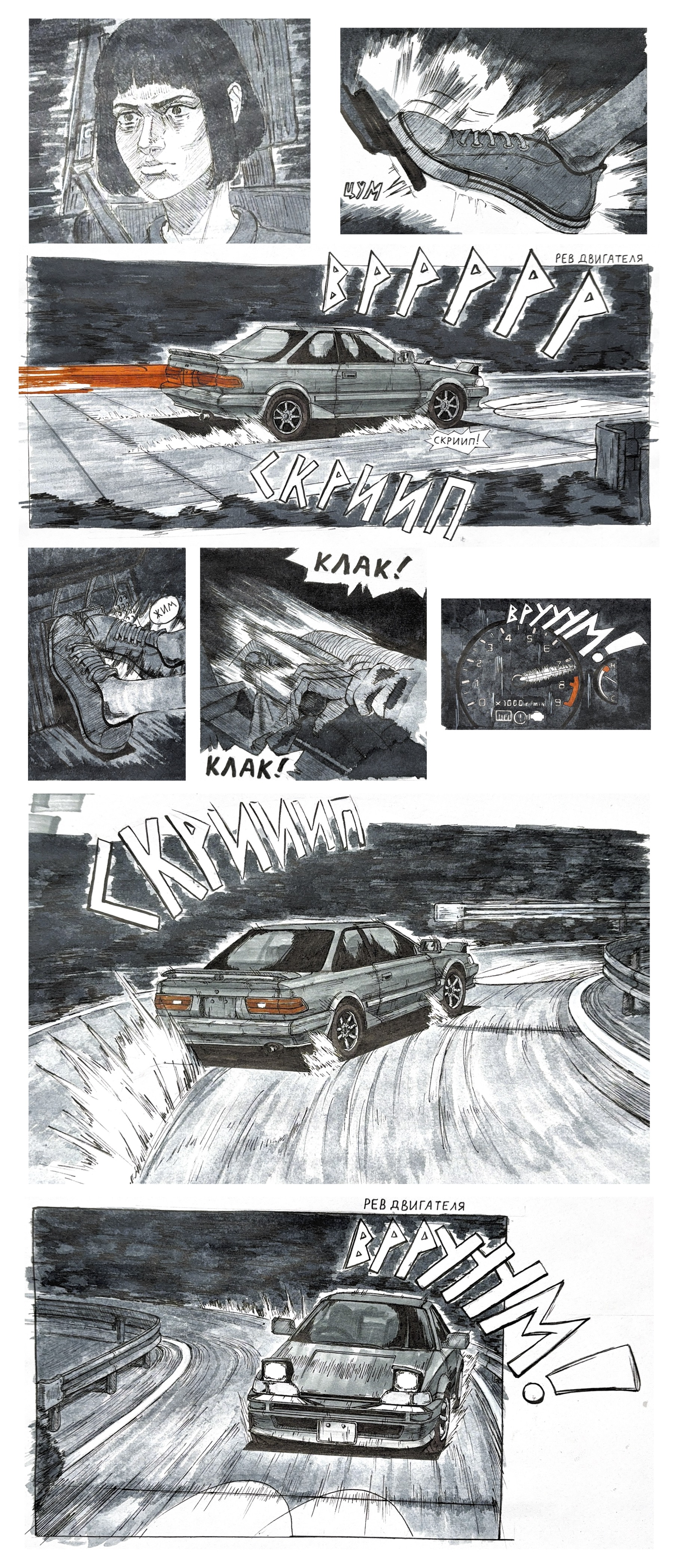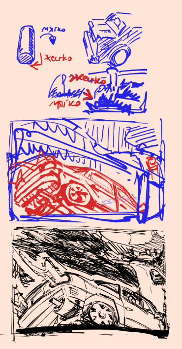 >>923504 → в глаза в первую очередь бросается что по пропорциям машина какая-то толстая и мыло под колесом. потом становится видно что композа как то плохо передает смысл происходящего на редлайне вообще хочется эту машину как угодно сдвинуть, лишь бы вот этого ракурса снизу вверх не было, но я его оставлю потому что чертить всю машину в новом ракурсе я точно не буду, плюс опять будут ныть что ракурс поменял и поэтому нещитово >пропорции если у тебя окна занимают где-то 2/5 высоты машины, то и в фишае тоже должно быть 2/5. на пикче окна очень маленькие, из-за чего машина выглядит ненатурально. машина в целом слишком квадратная и задница слишком большая как по мне, если смотреть на страницы из того же инишл ди, то там мангака, кроме железного соблюдения пропорций, всегда четко отрисовывает крылья, бамперы, изгибы и швы на корпусе >мыло на машине кисть применена вполне себе, потому что там ты в принципе понимал как форма изгибается (квадратно, но все таки), а на земле ты в принципе не понял как форму горы с травой показать и поэтому развел мыло в нормальном случае нужно мягкие переходы формы показывать мягкой кистью, а жесткие жесткой. грубо говоря бок цилиндра можно показать мягкой кистью, а торцы отделить от него жестко с травой все довольно просто, потому что у низа пучка все можно заливать мылом, потому что там расстояние маленькое, а сверху жестко очерчивать силуэт каждого куста, потому что там больше расстояние >композиция композиция это отчасти умение располагать предметы в кадре, так чтобы зритель увидел и понял все, что изображено на картинке. в этом кадре много места занимает небо и это наверное хорошо, но масса машины и масса горы во1 сливаются, а во2 похожие по размерам в кадре. что-то одно должно быть больше или вообще не должно быть в кадре. акцент должен быть на тачке, поэтому все остальное я бы верызал/уменьшил максимально. в целом если вы можете что-то из кадра вырезать за ненадобностью, это надо вырезать. еще из важного, в инишл ди, четко видно что машину в кадре заносит от того направления в которое она дрифтует. т.е. если машина едет направо, то она в левой половине кадра и наоборот. у тебя она дрифтует направо/к центру кадра, и находится справа/в центре кадра. еще там постоянно показывают противника в гонке, который немного впереди, это тоже стоит добавить >идея при таком вылете машина или встречает лбом гору, либо вываливается за барьер, не очень понятно какой исход должен быть. я это максимально обрежу потому что иногда надо все таки уменьшать себе количество жопочасов за счет упрощения картинки
