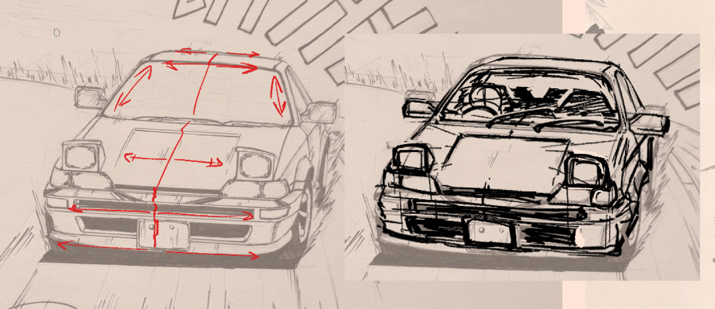 >>922715 → >>923320 → >>923320 → у тебя довольно неплохо получается, и в плане рендера маркерами и в плане композиции на многих кадрах. плюс ты аккуратно машины прорисовываешь и мне нравится как ты хорошо акценты ставишь в некоторых местах есть ощущение что перспектива слегка разъезжается, но по сути с тем что я нарисовал разница минимальна, я скорее всего более кривое нарисовал даже потому что толком не проверял ничего и делал на глаз. просто старайся следить, чтобы была осевая линия вдоль всей машины и чтобы расстояния от этой осевой были с обеих сторон одинаковые, у тебя получилось например что дальняя сторона лобовухи чуть шире ближней, по перспективе чуть чуть больше должна быть ближняя часть тут очевидно что нужно робертсона навернуть, он буквально при рисование такого и аккуратное простраивание насквозь. скетчинг про то как промышленные предметы рисовать и потом маркерами выделять, это тебе тоже поможет и руку поставить на симметрии в перспективе и маркерами рисовать