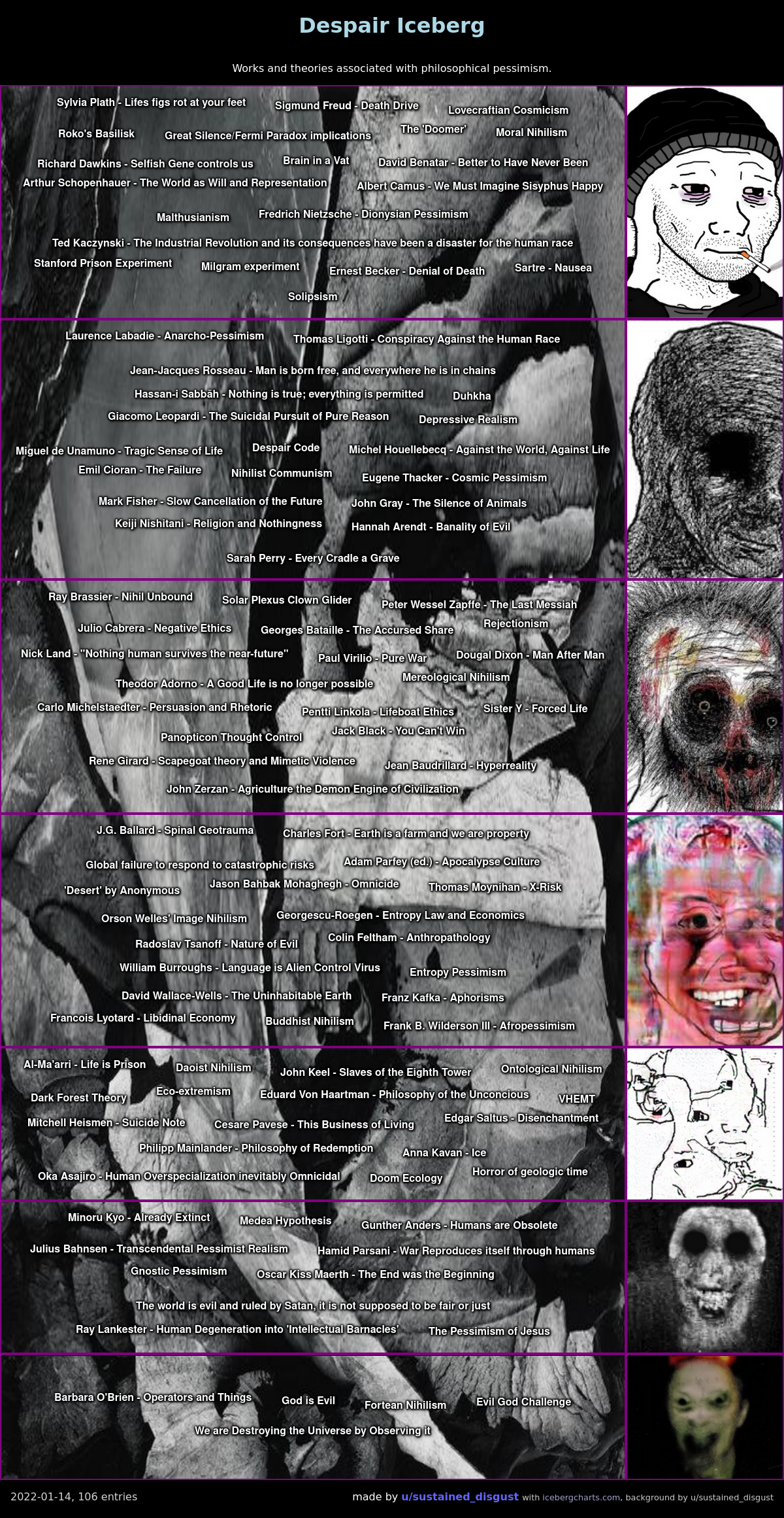 Нехудожка: - Шопенгауэр - Лиготти - заговор прготив человеческой расы - Цапффе - последний мессия, О трагичном - Ницше* в пессимистичном прочтении - Д.Бенатар - лучше никогда не быть - Mitchell Heisman - Эвола - оселдать тигра - Жиль Липовецки - Чоран - Юджин Такер - Cosmic Pessimism, Ужас философии - Бодрийяр, можно начать с эссе - Филипп Майнлендер - Толстой - исповедь