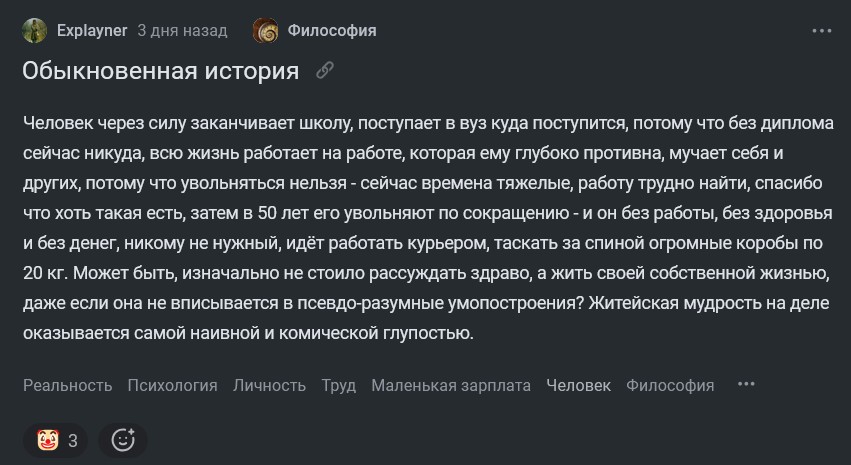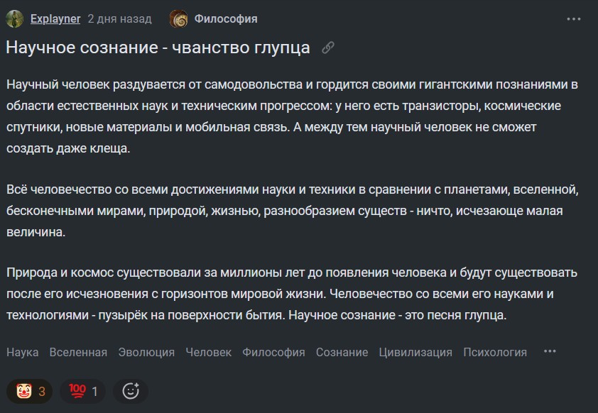 Уже ясно и понятно, что наша /ph/ потихоньку умирает, но от этого число тупых людей на ней не убавляется. Тем не менее, наши глупцы и рядом не стоят с одним из самых активных шизов с темы Философии на Пикабу. Вашему вниманию-Explayner, или же просто философ Дима. Дима парень не простой, живет в Челябинске, изучает Ф.Достоевского и его книги, но что самое главное, он является философом. Философом не простым, а неоплатоником ебать. Так-же является литературным критиком. Занимается он своей философской деятельностью уже 9 лет на кексике. Скрины с его мнением к ознакомлению обязательны. Что думаете, Господа?