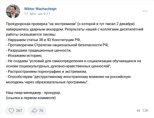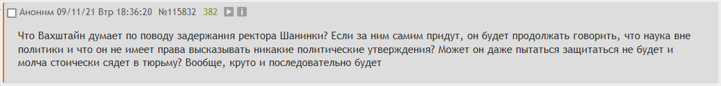 >Что Вахштайн думает по поводу задержания ректора Шанинки? Если за ним самим придут, он будет продолжать говорить, что наука вне политики и что он не имеет права высказывать никакие политические утверждения? Может он даже пытаться защитаться не будет и молча стоически сядет в тюрьму? Вообще, круто и последовательно будет Не стал дожидаться и свалил. Интересно наблюдать за исполнителем социальной роли веберовского ученого в экстренных обстоятельствах, классный социологический эксперимент правительство устроило (а говорят что не поддерживают науку)