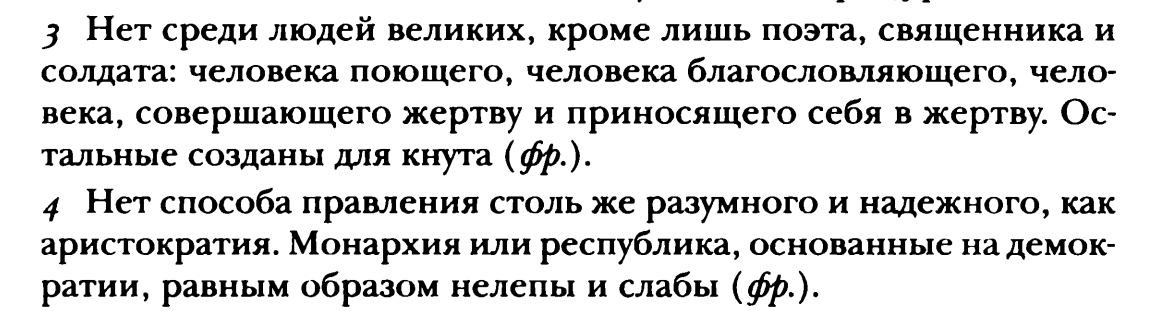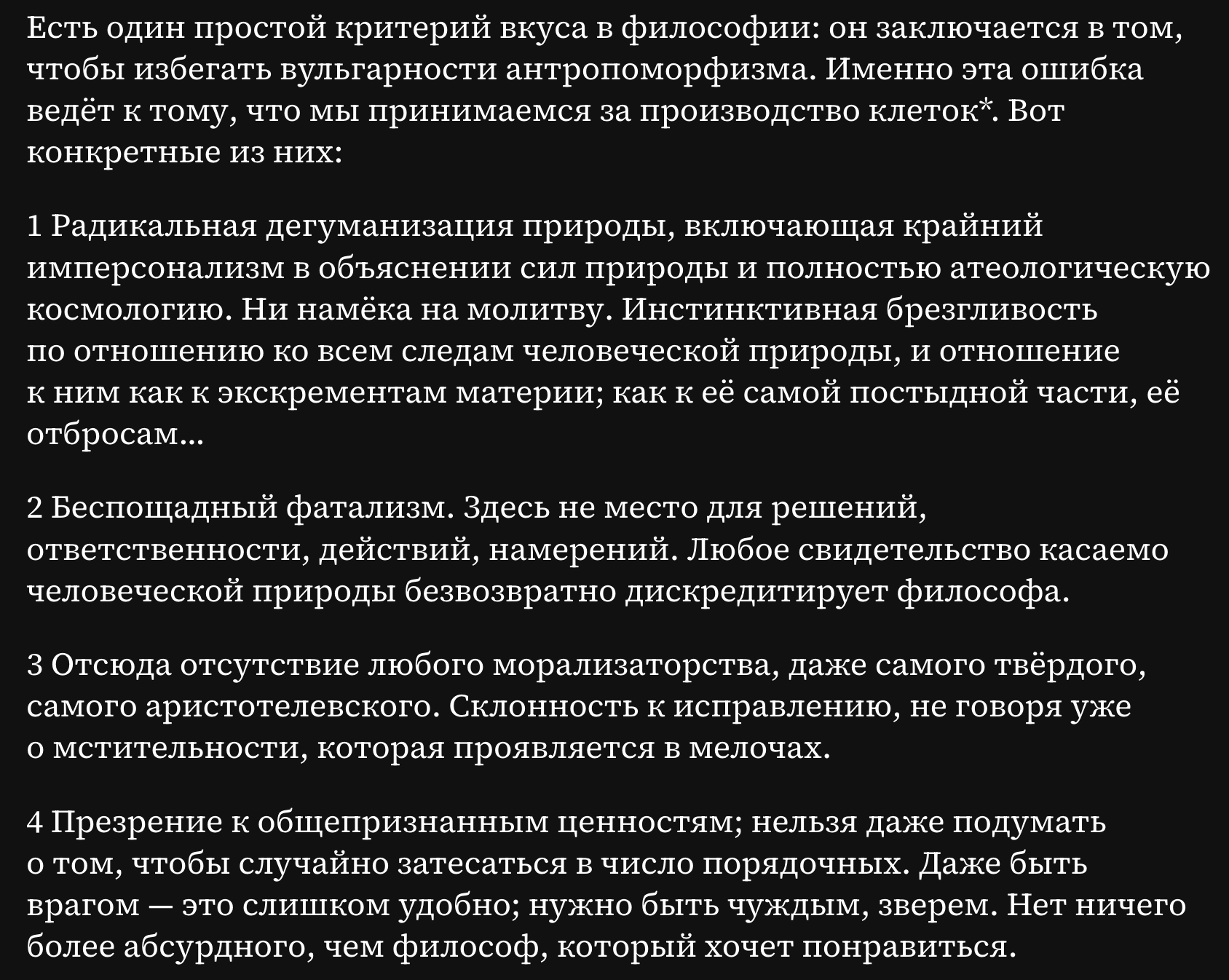 >ни разу не написал, как должно быть «Людям, до которых мне хоть сколько-нибудь есть дело, я желаю пройти через страдания, покинутость, болезнь, насилие, унижения — я желаю, чтобы им не остались неизвестны глубокое презрение к себе, муки неверия в себя, горечь и пустота преодолённого; я им нисколько не сочувствую, потому что желаю им единственного, что на сегодня способно доказать, имеет человек цену или не имеет: в силах ли он выстоять...»