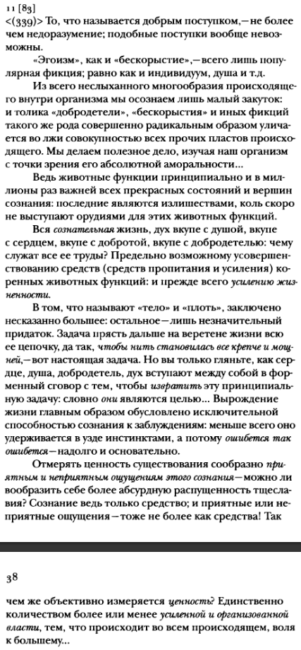 > он сам называет эту концепцию пессимистической Называет-то называет. Но то даже не пессимизм, как его обыватели понимают, и не либидинальный материализм (потому что идёт принятие), а "пессимизм силы", то есть - фатализм, продуманный до конца - amor fati. Короче, это что ни на есть > Philosophie der Gleichgültigkeit > Was früher am stärksten reizte, wirkt jetzt ganz anders, es wird nur noch als Spiel angesehn und gelten gelassen (die Leidenschaften und Arbeiten) als ein Leben im Unwahren principiell verworfen, als Form und Reiz aber ästhetisch genossen und gepflegt, wir stellen uns wie die Kinder zu dem, was früher den Ernst des Daseins ausmachte. > Unser Streben des Ernstes ist aber alles als werdend zu verstehen, uns als Individuum zu verleugnen, möglichst aus vielen Augen in die Welt sehen, leben in Trieben und Beschäftigungen, um damit sich Augen zu machen, zeitweilig sich dem Leben überlassen, um hernach zeitweilig über ihm mit dem Auge zu ruhen: die Triebe unterhalten als Fundament alles Erkennens, aber wissen, wo sie Gegner des Erkennens werden: in summa abwarten, wie weit das Wissen und die Wahrheit sich einverleiben können – und in wiefern eine Umwandlung des Menschen eintritt, wenn er endlich nur noch lebt, um zu erkennen. – Dies ist Consequenz von der Leidenschaft der Erkenntniß: es giebt für ihre Existenz kein Mittel, als die Quellen und Mächte der Erkenntniß, die Irrthümer und Leidensch<aften> auch zu erhalten, aus deren Kampfe nimmt sie ihre erhaltende Kraft. К пессимизму что полагается в треде, к унынию, - это не имеет никакого отношения. Трагическое мировоззрение, разве что (даже дифирамбическое? у дифирамбов-то была перформативная функция, их не просто читать надо было, а практически петь, - чтобы они произвели задуманный эффект).